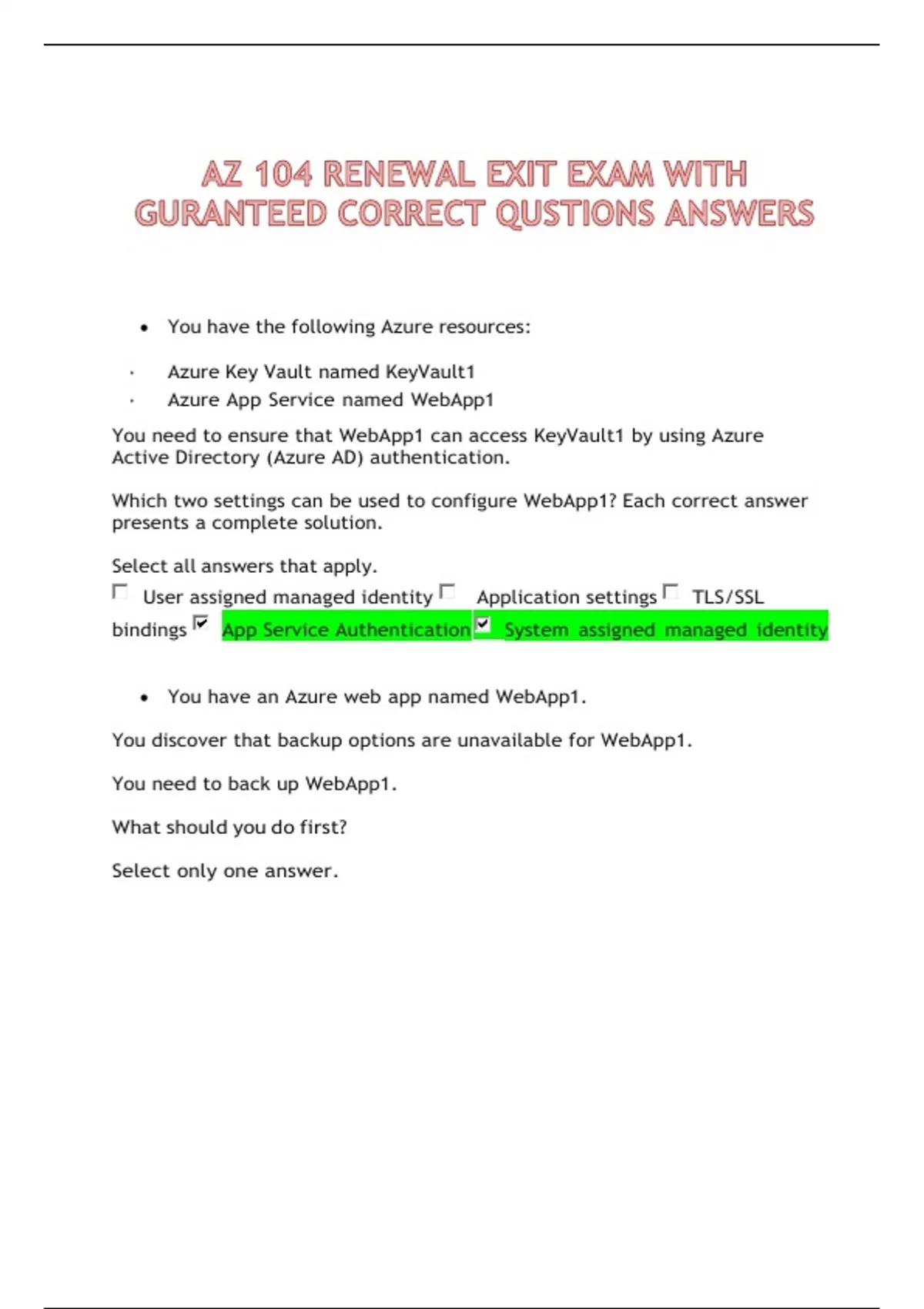 AZ 104 RENEWAL EXIT EXAM WITH GURANTEED CORRECT QUSTIONS ANSWERS You have the following Azure resources: • Azure Key Vault named KeyVault1 • Azure App Service named WebApp1 You need to ensure that WebApp1 can access KeyVault1 by using Azure Active Directory (Azure AD) authentication. Which two settings can be used to configure WebApp1? Each correct answer presents a complete solution. Select all answers that apply. User assigned managed identity Application settings TLS/SSL bindings App Service Authentication System assigned managed identity You have an Azure web app named WebApp1. You discover that backup options are unavailable for WebApp1. You need to back up WebApp1. What should you do first? Select only one answer. Modify the platform settings of WebApp1. Modify the Application settings of WebApp1. Scale up the app service plan. Scale out the app service plan. You plan to deploy an Azure web app that will have the following settings: • Name: WebApp1 • Publish: Docker container • Operating system: Windows • Region: West US • Windows Plan (West US): ASP-RG1-8bcf You need to ensure that WebApp1 uses the ASP.NET v4.7 runtime stack. Which setting should you modify? Select only one answer. Region Operating system Publish Windows Plan You have an Azure web app named Contoso2023. You add a deployment slot to Contoso2023 named Slot1. You need to be able to perform a deployment slot swap with preview. What should you modify? Select only one answer. application settings for Contoso2023 general settings for Contoso2023 application settings for Contoso2023-Slot1 general settings for Contoso2023-Slot1 You plan to create an Azure container instance named container1 that will use a Docker image named Image1. You need to ensure that container1 has persistent storage. Which Azure resources should you deploy for the persistent storage? Select only one answer. an Azure container registry only an Azure Storage account and a file share an Azure Storage account and a blob container an Azure SQL database only You have an Azure container registry named Registry1. You enable the admin user for Registry1. Which username should you use to connect to Registry1 as an admin user? Select only one answer. root Admin Administrator Registry1 R