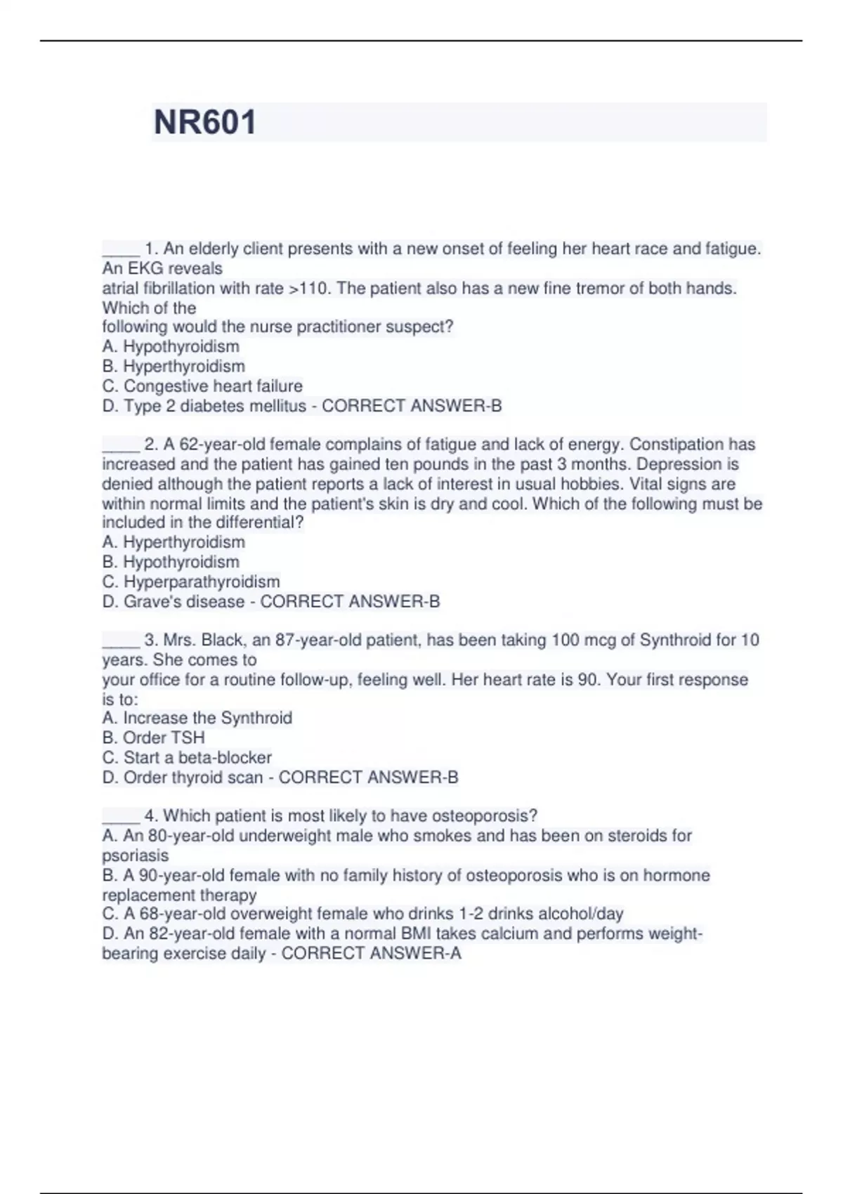 NR601 ____ 1. An elderly client presents with a new onset of feeling her heart race and fatigue. An EKG reveals atrial fibrillation with rate 110. The patient also has a new fine tremor of both hands. Which of the following would the nurse practitioner suspect? A. Hypothyroidism B. Hyperthyroidism C. Congestive heart failure D. Type 2 diabetes mellitus - CORRECT ANSWER-B ____ 2. A 62-year-old female complains of fatigue and lack of energy. Constipation has increased and the patient has gained ten pounds in the past 3 months. Depression is denied although the patient reports a lack of interest in usual hobbies. Vital signs are within normal limits and the patient's skin is dry and cool. Which of the following must be included in the differential? A. Hyperthyroidism B. Hypothyroidism C. Hyperparathyroidism D. Grave's disease - CORRECT ANSWER-B ____ 3. Mrs. Black, an 87-year-old patient, has been taking 100 mcg of Synthroid for 10 years. She comes to your office for a routine follow-up, feeling well. Her heart rate is 90. Your first response is to: A. Increase the Synthroid B. Order TSH C. Start a beta-blocker D. Order thyroid scan - CORRECT ANSWER-B ____ 4. Which patient is most likely to have osteoporosis? A. An 80-year-old underweight male who smokes and has been on steroids for psoriasis B. A 90-year-old female with no family history of osteoporosis who is on hormone replacement therapy C. A 68-year-old overweight female who drinks 1-2 drinks alcohol/day D. An 82-year-old female with a normal BMI takes calcium and performs weightbearing exercise daily - CORRECT ANSWER-A ____ 5. When evaluating the expected outcome for a hypothyroid elderly patient placed on levothyroxine, the nurse practitioner will: A. Assess a weekly TSH B. Assess the TSH in 4-6 weeks C. Ask the patient if the symptoms have subsided and adjust dosage accordingly D. Decrease the dosage should a cardiac event occur - CORRECT ANSWER-5. ANS: B PTS: 1 ____ 6. A postmenopausal woman with osteoporosis is taking a bisphosphonate daily by mouth. What action information statement would indicate the patient understood the nurse practitioner's instructions regarding this medication? A. Takes medication at bedtime with a full glass of water B. Takes medication with a full glass of water when up in a.m. 30 minutes prior to other food and medications C. Takes medication when up in a.m. with a glass of orange juice to increase absorption D. Takes medica - CORRECT ANSWER-6. ANS: B PTS: 1 ____ 7. The primary reason levothyroxine sodium is initiated at a low dose in an elderly patient with hypothyroidism is to prevent which of the following untoward effects? A. Angina and arrhythmia B. Nausea and diarrhea C. Confusion and delirium D. Osteoporosis and muscle weakness - CORRECT ANSWER-7. ANS: A PTS: 1 ____ 8. Six months ago an elderly patient was diagnosed with subclinical hypothyroidism. Today the patient returns and has a TSH of 11.0 and complains of fatigue. He has taken Synthroid 25 mcg daily as prescribed. What is the best course of action for the nurse practitioner? A. Assess further for a cause of fatigue B. Double the dose of Synthroid C. Discontinue the Synthroid D. Prescribe Liotrix (T3 & T4 combination) - CORRECT ANSWER-8. ANS: B PTS: 1 ____ 9. A fluoroquinolone (Ciprofloxin) is prescribed for a male patient with a UTI. What should the nurse practitioner teach the patient regarding taking this medication? A. It must be taken on an empty stomach B. Its effectiveness is decreased by antacids, iron, or caffeine ingestion C. It may cause a metallic aftertaste D. Its effectiveness is not a concern and it can be taken with any medications - CORRECT ANSWER-9. ANS: B PTS: 1 ____ 10. A patient has been prescribed metformin (Glucophage). One week later he returns with lowered blood sugars but complains of some loose stools during the week. How should the nurse practitioner respond? A. Discontinue the medication immediately B. Reassure the patient that this is an anticipated side effect C. Double the dosage of medication and have patient return in 1 week D. Order a chem. 7 to check for lactic acidosis - CORRECT ANSWER-10. ANS: B PTS: 1 ____ 11. Which of the following signs of hyperthyroidism commonly manifest in younger populations, but is notably lacking in the elderly? A. Weight gain B. Constipation C. Bradycardia D. Exophthalmos - CORRECT ANSWER-11. ANS: D PTS: 1 ____ 12. A 60-year-old obese male client has type 2 diabetes mellitus and a lipid panel of TC = 250, HDL = 32, LDL = 165. The nurse practitioner teaches the patient about his modifiable cardiac risk factors, which include: A. Advancing age, diabetes, hyperlipidemia, and male gender B. Diabetes, obesity, and hyperlipidemia C. Hyperlipidemia, smoking, and family history of heart disease D. Male with age 45, diabetes mellitus, and hyperlipidemia - CORRECT ANSWER-B ____ 13. A diabetic patient presents with the complaint of right foot pain but denies any recent known injury. He states it has gotten progressively worse over the past few months. On exam, vibratory sense, as well as sensation tested with a monofilament, was abnormal. The patient's foot is warm, edematous, and misshapen. The nurse practitioner suspects Charcot foot. What intervention is indicated? A. Warm soaks and return for follow-up in 1 week B. Referral to a pain management clinic C. Refer - CORRECT ANSWER-C ____ 14. What is a sign of insulin resistance that can present in African American patients? A. Acanthosis Nigricans B. Psoriasis Nigricans C. Seborrheic Nigricans D. Bullemic Nigricans - CORRECT ANSWER-A ____ 15. During a routine physical examination of a 62-year-old female patient, the nurse practitioner identifies xanthelasma around both his eyes. What is the significance of this finding? A. High potential for future blindness and requires immediate referral B. None, normal variant of aging process C. Abnormal lipid metabolism requiring medical management D. Hereditary variant that is of no consequence but r