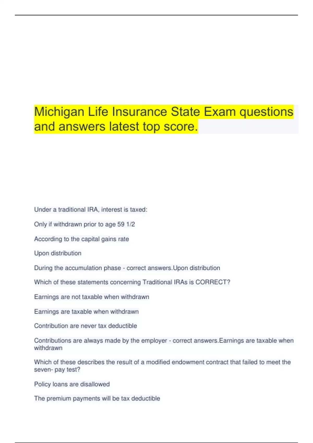 Michigan Life Insurance State Exam questions and answers latest top score. Under a traditional IRA, interest is taxed: Only if withdrawn prior to age 59 1/2 According to the capital gains rate Upon distribution During the accumulation phase - correct answers.Upon distribution Which of these statements concerning Traditional IRAs is CORRECT? Earnings are not taxable when withdrawn Earnings are taxable when withdrawn Contribution are never tax deductible Contributions are always made by the employer - correct answers.Earnings are taxable when withdrawn Which of these describes the result of a modified endowment contract that failed to meet the seven- pay test? Policy loans are disallowed The premium payments will be tax deductible Pre- death distributions are typically taxable Withdrawals will be prohibited - correct answers.Pre- death distributions are typically taxable In order for a contract to be valid, it must be filled with the state be signing and witnessed by an attorney be in writing contain offer and acceptance - correct answers.Contain offer and acceptance Which of the following actions is REQUIRED by a producer who is replacing an existing life insurance policy? Keep replacement records on file for at least 10 years Notify the existing insurer of the proposed replacement Submit to the replacing insurer a list of the policies to be replaced Offer the insured a 60- day free- look period - correct answers.Submit to the replacing insurer a list of the policies to be replaced Who were Keogh plans designed to provide pension benefits for? Corporate officers Public school employees The self-employed Government employees - correct answers.The self emplyed A producer's fiduciary duty requires that premiums are maintained in a personal bank account until remittance to insurer premiums be deposited in an interest bearing account premiums are forwarded to the insurer on a timely basis premiums be commingled - correct answers.Premiums are forwarded on a timely basis An individual who removes the risk of losing money in the stock market by never purchasing stocks is said to be engaging in Risk reduction Risk Transference Risk avoidance Risk retention - correct answers.Risk avoidance A type of group that has a constitution and has been organized for purposes other than obtaining insurance is called a(n) employer group employee group association or labor group multiple coalition - correct iation or labor group Which of the following is NOT a federal requirement of a qualified plan? Must benefit a broad cross-section of employees Employee must be able to make unlimited contributions Vesting schedule must be defined Employer establishes the plan - correct answers.Employee must be able to make unlimited contributions The acceptance of a credit life application requires the submission of a certificate of insurance to the insured within __ days. 10 20 30 40 - correct answers.30 What does the Group Life underwriting risk selection process help protect insurance companies from? Risk aversion Natural selection Adverse selection Risk Management - correct answers.Adverse Selection A guaranteed issue insurance policy has no initial premium requirement incontestable period waiting period medical underwriting - correct answers.Medical Underwriting A Universal Life policyowner must receive a notice of cash surrender value at LEAST every 6 months year 2 years 5 years - correct A Roth IRA owner must be at least what age in order to make tax free withdrawals? 59 1/2 and owned account for a minimum of 10 years 59 1/2 and owned account minimum of 5 years 70 1/2 and owned account for a minimum of 10 years 70 1/2 and owned account for a minimum of 5 years - correct answers.59 1/2 and owned the account for 5 years In Michigan, legal action may be taken against an insurer for up to ___ Years for failing to pay a life insurance claim after proof of loss was submitted 4 5 6 7 - correct answers.6 Level premium permanent insurance accumulates a reserve that will eventually equal the face amount of the policy pay a dividend to the policyowner require the policyowner to make periodic withdrawals become larger than the face amount - correct the face amount of the policy Under a life insurance policy, what does the insuring clause state? The agents obligation to provide the proper amount of coverage The insurers obligation to return all premiums upon an approved death claim The Insurers obligation to pay a death benefit upon an approved death claim The agents obligation to pay a death benefit upon an approved death claim - correct answers.The Insurers obligation to pay a death benefit upon an approved death claim Term insurance is appropriate for someone who seeks living benefits for themselves seeks a policy that builds cash value seeks temporary protection and lower premiums seeks permanent protection and higher premiums - correct temporary protection and lower premiums Bob and Tom start a business. Since each partner contributes an important element to the success of the business, they decide to take life insurance policies out on each other, and name each other as beneficiaries. Eventually, they retire and dissolve the business. Bob dies 12 months later. The policies continue in force with no change. Both partners are still married at the time of Bob's death. In this situation, who will receive Bob's policy proceeds? Toms estate Bobs estate Bobs spouse - correct answers.Tom Michigan requires that a licensee complete __ hours of continuing education on the subject of ethics every reporting period 1 2 3 4 - correct answers.3 What kind of insurance policy issued by a mutual insurer provides a return of divisible surplus? Nonparticipating life insurance policy participating life insurance policy divisible surplus life insurance policy straight life insurance policy - correct answers.Participating life insurance policy Which of these would limit a company's liability to provide insurance coverage? Waiver Exclusion Rider Prov