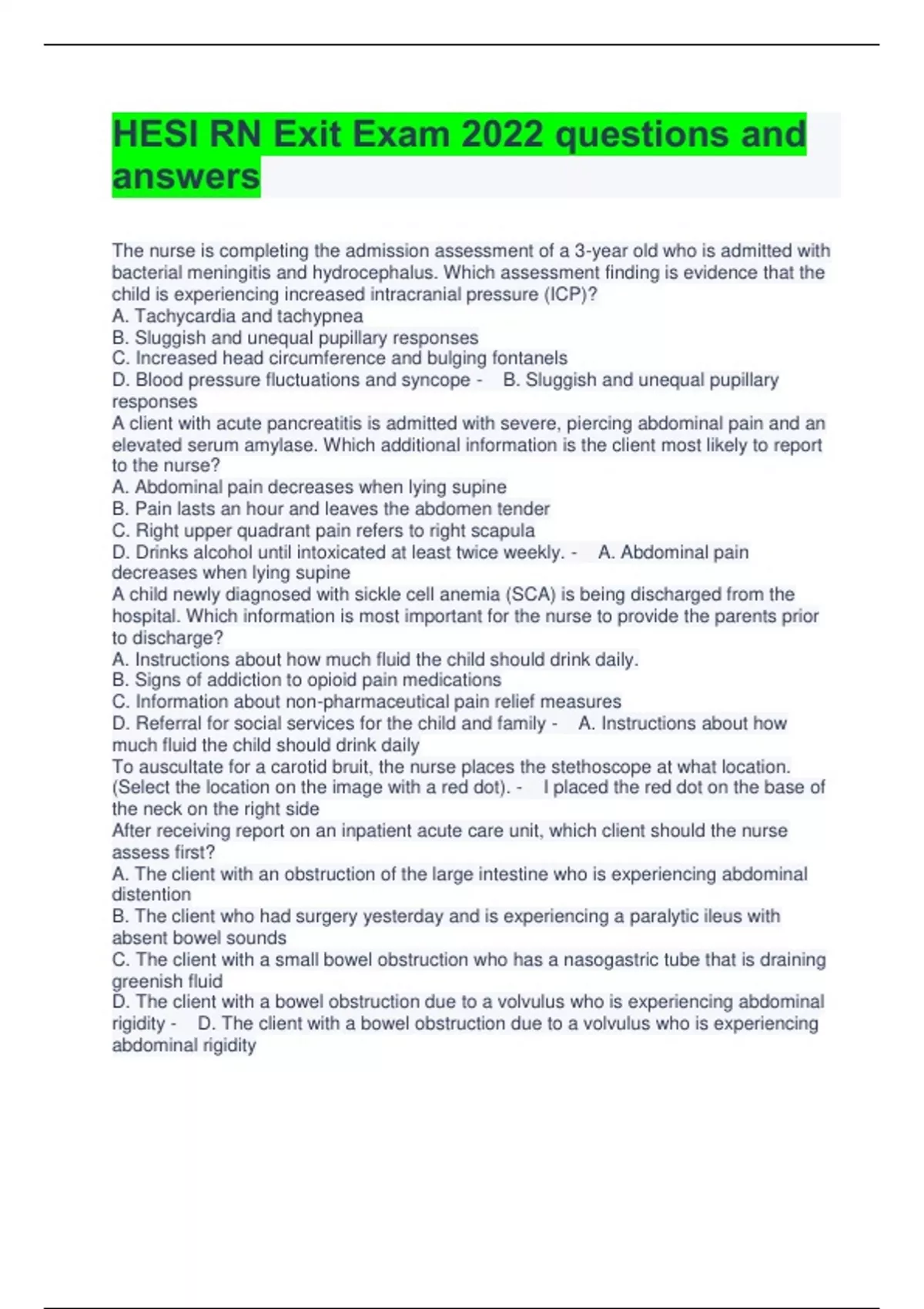 HESI RN Exit Exam 2022 questions and answers The nurse is completing the admission assessment of a 3-year old who is admitted with bacterial meningitis and hydrocephalus. Which assessment finding is evidence that the child is experiencing increased intracranial pressure (ICP)? A. Tachycardia and tachypnea B. Sluggish and unequal pupillary responses C. Increased head circumference and bulging fontanels D. Blood pressure fluctuations and syncope - B. Sluggish and unequal pupillary responses A client with acute pancreatitis is admitted with severe, piercing abdominal pain and an elevated serum amylase. Which additional information is the client most likely to report to the nurse? A. Abdominal pain decreases when lying supine B. Pain lasts an hour and leaves the abdomen tender C. Right upper quadrant pain refers to right scapula D. Drinks alcohol until intoxicated at least twice weekly. - A. Abdominal pain decreases when lying supine A child newly diagnosed with sickle cell anemia (SCA) is being discharged from the hospital. Which information is most important for the nurse to provide the parents prior to discharge? A. Instructions about how much fluid the child should drink daily. B. Signs of addiction to opioid pain medications C. Information about non-pharmaceutical pain relief measures D. Referral for social services for the child and family - A. Instructions about how much fluid the child should drink daily To auscultate for a carotid bruit, the nurse places the stethoscope at what location. (Select the location on the image with a red dot). - I placed the red dot on the base of the neck on the right side After receiving report on an inpatient acute care unit, which client should the nurse assess first? A. The client with an obstruction of the large intestine who is experiencing abdominal distention B. The client who had surgery yesterday and is experiencing a paralytic ileus with absent bowel sounds C. The client with a small bowel obstruction who has a nasogastric tube that is draining greenish fluid D. The client with a bowel obstruction due to a volvulus who is experiencing abdominal rigidity - D. The client with a bowel obstruction due to a volvulus who is experiencing abdominal rigidity A teenager presents to the emergency department with palpitations after vaping at a party. The client is anxious, fearful, and hyperventilating. The nurse anticipates the client developing which acid base im
