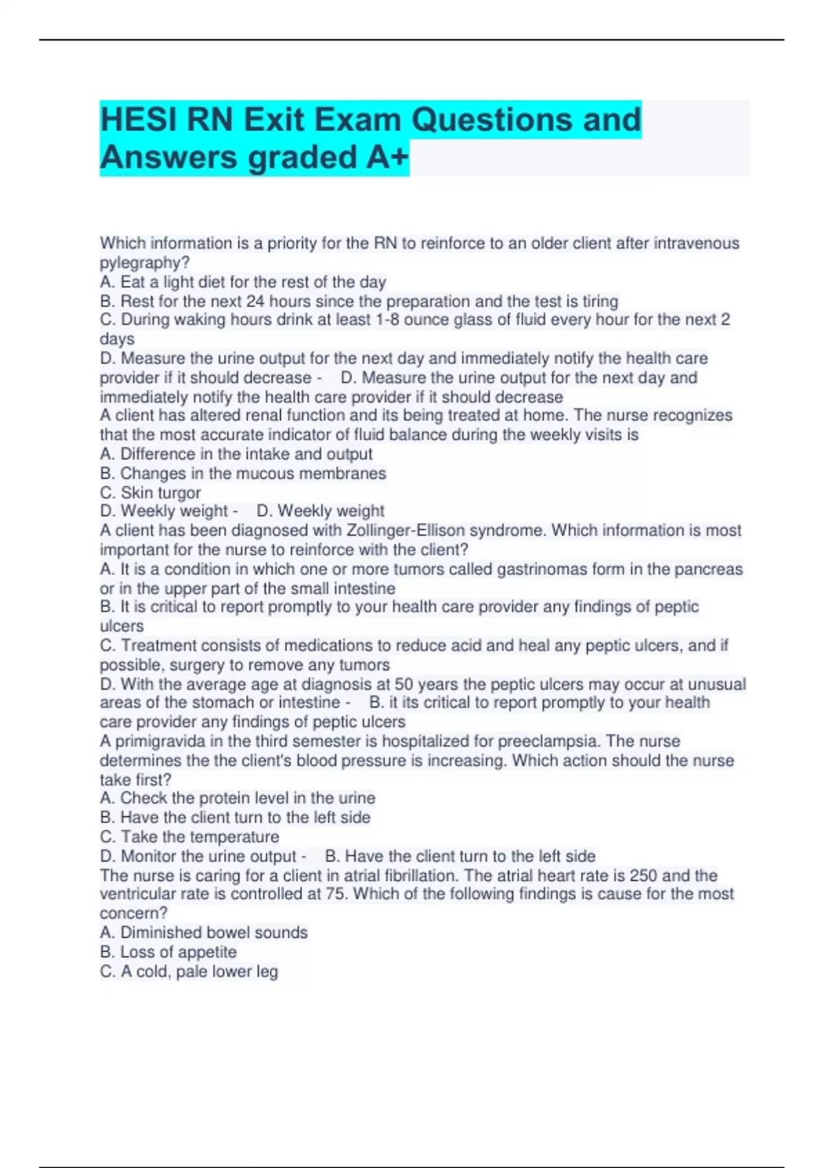 HESI RN Exit Exam Questions and Answers graded A+ Which information is a priority for the RN to reinforce to an older client after intravenous pylegraphy? A. Eat a light diet for the rest of the day B. Rest for the next 24 hours since the preparation and the test is tiring C. During waking hours drink at least 1-8 ounce glass of fluid every hour for the next 2 days D. Measure the urine output for the next day and immediately notify the health care provider if it should decrease - D. Measure the urine output for the next day and immediately notify the health care provider if it should decrease A client has altered renal function and its being treated at home. The nurse recognizes that the most accurate indicator of fluid balance during the weekly visits is A. Difference in the intake and output B. Changes in the mucous membranes C. Skin turgor D. Weekly weight - D. Weekly weight A client has been diagnosed with Zollinger-Ellison syndrome. Which information is most important for the nurse to reinforce with the client? A. It is a condition in which one or more tumors called gastrinomas form in the pancreas or in the upper part of the small intestine B. It is critical to report promptly to your health care provider any findings of peptic ulcers C. Treatment consists of medications to reduce acid and heal any peptic ulcers, and if possible, surgery to remove any tumors D. With the average age at diagnosis at 50 years the peptic ulcers may occur at unusual areas of the stomach or intestine - B. it its critical to report promptly to your health care provider any findings of peptic ulcers A primigravida in the third semester is hospitalized for preeclampsia. The nurse determines the the client's blood pressure is increasing. Which action should the nurse take first? A. Check the protein level in the urine B. Have the client turn to the left side C. Take the temperature D. Monitor the urine output - B. Have the client turn to the left side The nurse is caring for a client in atrial fibrillation. The atrial heart rate is 250 and the ventricular rate is controlled at 75. Which of the following findings is cause for the most concern? A. Diminished bowel sounds B. Loss of appetite C. A cold, pale lower leg D. Tachypnea - C. A cold, pale lower leg The client with ineffective endocarditis must be assessed frequently by the home health nurse. Which finding suggests that antibiotic therapy is not effective, and must be reported by the nurse immediately to the health care provider? A. Nausea and vomiting B. Fever of 103 degrees Fahrenheit (39.5 degrees Celsius) C. Diffuse macular rash D. Muscle tenderness - B. Fever of 103 degrees Fahrenheit (39.5 degrees Celsius) A client who had a vasectomy is in the post recovery unit at an outpatient clinic. Which of these points is most important to be reinforced by the nurse? A. Until the health care provider has determined that your ejaculate doesn't contain sperm B. This procedure doesn't impede the production of male hormones or the production of sperm in the testicles. The sperm can no longer enter your semen and no sperm are in your ejaculate. C. After your vasectomy, strenuous activity needs to be avoided for at least 48 hours. If your work doesn't involve hard physical labor, you can return to your job as soon as you feel up to it. The stitches generally dissolve in seven to ten days. D. The health care provider at this clinic recommends rest, ice, an athletic supporter or over the counter pain medication to relieve any discomfort - A. Until the health care provider has determined that your ejcaculate doesn't contain sperm A client who is to have antineoplastic chemotherapy tells the nurse of a fear of being sick all the time and wishes to try acupuncture. Which of these beliefs stated by the client would be incorrect about acupuncture? A. Some needles go as deep