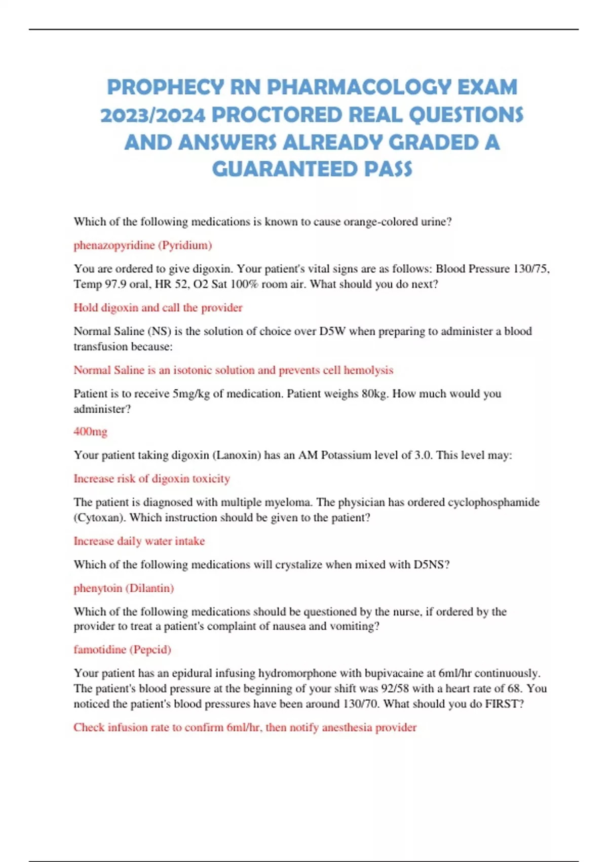PROPHECY RN PHARMACOLOGY EXAM 2023/2024 PROCTORED REAL QUESTIONS AND ANSWERS ALREADY GRADED A GUARANTEED PASS