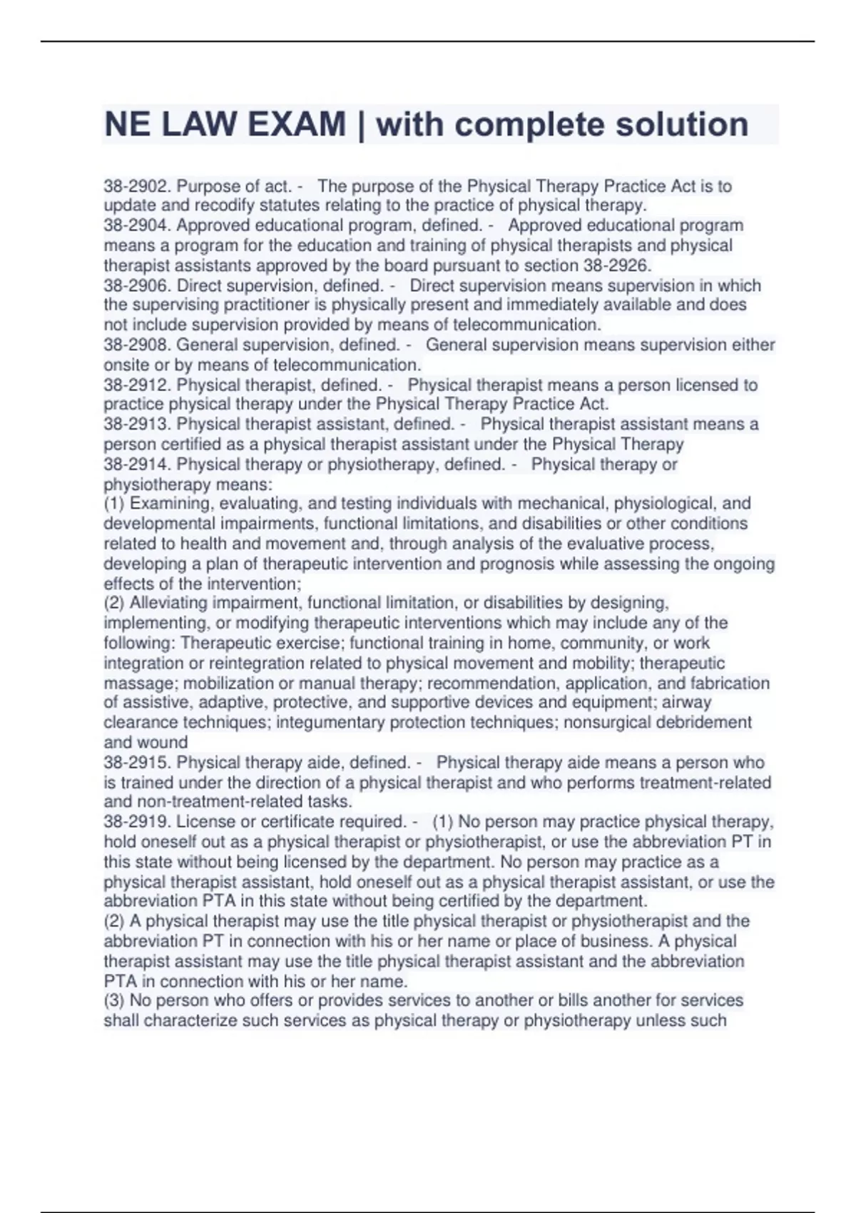 NE LAW EXAM | with complete solution 38-2902. Purpose of act. - The purpose of the Physical Therapy Practice Act is to update and recodify statutes relating to the practice of physical therapy. 38-2904. Approved educational program, defined. - Approved educational program means a program for the education and training of physical therapists and physical therapist assistants approved by the board pursuant to section 38-2926. 38-2906. Direct supervision, defined. - Direct supervision means supervision in which the supervising practitioner is physically present and immediately available and does not include supervision provided by means of telecommunication. 38-2908. General supervision, defined. - General supervision means supervision either onsite or by means of telecommunication. 38-2912. Physical therapist, defined. - Physical therapist means a person licensed to practice physical therapy under the Physical Therapy Practice Act. 38-2913. Physical therapist assistant, defined. - Physical therapist assistant means a person certified as a physical therapist assistant under the Physical Therapy 38-2914. Physical therapy or physiotherapy, defined. - Physical therapy or physiotherapy means: (1) Examining, evaluating, and testing individuals with mechanical, physiological, and developmental impairments, functional limitations, and disabilities or other conditions related to health and movement and, through analysis of the evaluative process, developing a plan of therapeutic intervention and prognosis while assessing the ongoing effects of the intervention;