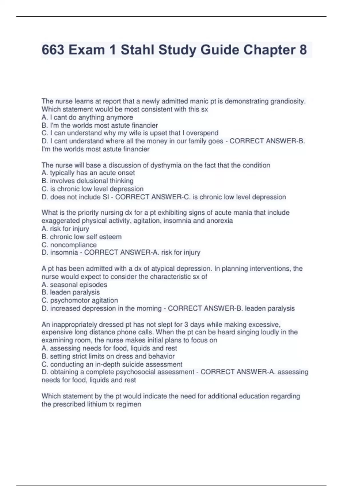 663 Exam 1 Stahl Study Guide Chapter 8 The nurse learns at report that a newly admitted manic pt is demonstrating grandiosity. Which statement would be most consistent with this sx A. I cant do anything anymore B. I'm the worlds most astute financier C. I can understand why my wife is upset that I overspend D. I cant understand where all the money in our family goes - CORRECT ANSWER-B. I'm the worlds most astute financier The nurse will base a discussion of dysthymia on the fact that the condition A. typically has an acute onset B. involves delusional thinking C. is chronic low level depression D. does not include SI - CORRECT ANSWER-C. is chronic low level depression What is the priority nursing dx for a pt exhibiting signs of acute mania that include exaggerated physical activity, agitation, insomnia and anorexia A. risk for injury B. chronic low self esteem C. noncompliance D. insomnia - CORRECT ANSWER-A. risk for injury A pt has been admitted with a dx of atypical depression. In planning interventions, the nurse would expect to consider the characteristic sx of A. seasonal episodes B. leaden paralysis C. psychomotor agitation D. increased depression in the morning - CORRECT ANSWER-B. leaden paralysis An inappropriately dressed pt has not slept for 3 days while making excessive, expensive long distance phone calls. When the pt can be heard singing loudly in the examining room, the nurse makes initial plans to focus on A. assessing needs for food, liquids and rest B. setting strict limits on dress and behavior C. conducting an in-depth suicide assessment D. obtaining a complete psychosocial assessment - CORRECT ANSWER-A. assessing needs for food, liquids and rest Which statement by the pt would indicate the need for additional education regarding the prescribed lithium tx regimen A. i will restrict my daily salt intake B. i will take my meds with food C. i will have my blood drawn on schedule D. i will drink 8 to 12 glasses of liquids daily - CORRECT ANSWER-A. i will restrict my daily salt intake The nurse would evaluate that pt ed regarding lithium therapy for an individual with bipolar disorder as effective if the pt states A. I can stop my lithium when I feel better B. I can continue with my diuretic and cardiac meds C. I will probably need to take the lithium for the rest of my life D. I will taper my lithium when a therapeutic serum level is achieved - CORRECT ANSWER-C. I will probably need to take the lithium for the rest of my life A pt who has been taking lithium 300mg TID comes to the outpt department with a list of meds he is taking. Which of the meds on the list would require re-evaluation of lithium dosage A. hydrodiuril daily B. navane BID C. ativan at HS D. cefobid daily - CORRECT ANSWER-A. hydrodiuril daily Which outcomes would be appropriate to determine early favorable response to antidepressant med A. the pt will complete own self care activities B. the pt will demonstrate assertive communication skills C. the pt will describe signs and sx of MDD D. the pt will make plans to attend one community social activity a week - CORRECT ANSWER-A. the pt will complete own self care activities Prior to initiating med therapy with phenelzine, the nurse should plan to determine the pt's A. mood and affect B. activity level C. cognitive ability to understand information about the med D. support network and its members willingness to participate in tx - CORRECT ANSWER-C. cognitive ability to understand information about the med A pt who has a hx of bipolar disorder recently underwent orthopedic surgery and was discharged to return home. When visited by the home care nurse, the nurse documented the following: slow and soft speech; sad facial expression; and pt crying when describing extreme fatigue, low mood, and the feeling that he will never get well. He has refused to bathe and perform ADLs for several days. Which nursing dx would be appropriate A. self care deficit secondary to possible depression B. situational low - CORRECT ANSWER-A. self care deficit secondary to possible depression The nurse caring for an extremely withdrawn pt with depression wants to assist her to become more interactive. The best approach would be to say A. I know youll feel better if you leave your room B. You look so gloomy sitting here all by yourself C. lets explore how it feels to sit alone here all day and feel sad D. i need another person for a card game and id like you to be my partner - CORRECT ANSWER-D. i need another person for a card game and id like you to be my partner Which nursing dx would relate to the primary nursing concern r/t a recently written prescription for amitriptyline 50mg TID A. anxiety B. ineffective coping C. risk for self injury D. chronic low self esteem - CORRECT ANSWER-C. risk for self injury What information concerning amitriptyline 50mg TID would the nurse give the pt regarding the expected outcome of this med therapy A. complying with this therapy will cure your depression B. this med is expected to improve brain chemical imbalance C. amitriptyline will help re-establish you ability to think clearly again D. amitriptyline will be particular effective at assisting you in regaining your independence - CORRECT ANSWER-B. this med is expected to improve brain chemical imbalance Which princple should the nurse apply when planning nursing care for a pt who was vol admitted after a suicide attempt A. pts who attempt suicide and fail will not try again B. the more specific the plan, the greater the risk for suicide C. pts who talk about suicide are less likely to attempt it D. pts who attempt suicide and fail do not really want to die - CORRECT ANSWER-B. the more specific the plan, the greater the risk for suicide An appropriate nursing strategy to assist a pt who was invol admitted after a suicide attempt is A. avoiding any focus on the topic of suicide B. encouraging pt to verbalize personal feelings C. supporting pt focus on others rather than self D. discussing the impact o
