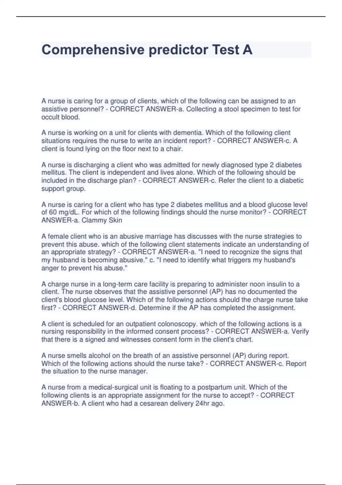 Comprehensive predictor Test A A nurse is caring for a group of clients, which of the following can be assigned to an assistive personnel? - CORRECT ANSWER-a. Collecting a stool specimen to test for occult blood. A nurse is working on a unit for clients with dementia. Which of the following client situations requires the nurse to write an incident report? - CORRECT ANSWER-c. A client is found lying on the floor next to a chair. A nurse is discharging a client who was admitted for newly diagnosed type 2 diabetes mellitus. The client is independent and lives alone. Which of the following should be included in the discharge plan? - CORRECT ANSWER-c. Refer the client to a diabetic support group. A nurse is caring for a client who has type 2 diabetes mellitus and a blood glucose level of 60 mg/dL. For which of the following findings should the nurse monitor? - CORRECT ANSWER-a. Clammy Skin A female client who is an abusive marriage has discusses with the nurse strategies to prevent this abuse. which of the following client statements indicate an understanding of an appropriate strategy? - CORRECT ANSWER-a. "I need to recognize the signs that my husband is becoming abusive." c. "I need to identify what triggers my husband's anger to prevent his abuse." A charge nurse in a long-term care facility is preparing to administer noon insulin to a client. The nurse observes that the assistive personnel (AP) has no documented the client's blood glucose level. Which of the following actions should the charge nurse take first? - CORRECT ANSWER-d. Determine if the AP has completed the assignment. A client is scheduled for an outpatient colonoscopy. which of the following actions is a nursing responsibility in the informed consent process? - CORRECT ANSWER-a. Verify that there is a signed and witnesses consent form in the client's chart. A nurse smells alcohol on the breath of an assistive personnel (AP) during report. Which of the following actions should the nurse take? - CORRECT ANSWER-c. Report the situation to the nurse manager. A nurse from a medical-surgical unit is floating to a postpartum unit. Which of the following clients is an appropriate assignment for the nurse to accept? - CORRECT ANSWER-b. A client who had a cesarean delivery 24hr ago. A nurse in a provider's office is collecting data from a parent of an infant who is being screened for cystic fibrosis. Which of the following supports a diagnosis of cystic fibrosis? - CORRECT ANSWER-a. Frothy stools. When caring for an assigned group of clients, the nurse should wear gloves when - CORRECT ANSWER-a. performing oral hygiene. A nurse is preparing a client for surgery. The client tells the nurse that he is concerned about the safety of a large sum of money in his wallet. Which of the following actions is appropriate for the nurse to take? - CORRECT ANSWER-b. contact security personnel to place the money in the facility safe. A nurse is caring for a client who is receiving heparin. Which of the following is the appropriate route of administration? - CORRECT ANSWER-d. Subcutaneously. A nurse is reinforcing teaching about car seat safety to the parents of a newborn. The nurse should instruct the parents to place the car seat in a? - CORRECT ANSWER-c. Rear-facing position in the back seat. A nurse is caring for a client and recognizes the client's rights to confidentiality have been breached in which of the following situations? - CORRECT ANSWER-a. A hospital risk manager includes information from a client's medical record in A nurse is caring for a client who had a femoral-popliteal bypass graft 2 days ago. When monitoring peripheral pulses, the nurse is unable to locate a pulse on the affected leg. Which of the following actions should the nurse take? - CORRECT ANSWER-c. Notify the charge nurse of the finding. A nurse is caring for a full-term newborn who was circumcised 6 hrs. ago. Which of the following findings indicates that the newborn is experiencing pain? - CORRECT ANSWER-b. Furrowed Brow A nurse is reinforcing teaching with a client about organ donation. Which of the following client statements indicated a need for further teaching? - CORRECT ANSWER-c. "My doctor should decide if my organs will be donated." A Client who is prescribed metoprolol (Lopressor) for hypertension tells the nurse, "I don't want to take this medication because it makes me tired all the time." Which of the following is the appropriate response? - CORRECT ANSWER-c. "Let's talk with your doctor about other options." A nurse is preparing to administer an IM injection to a client. To reduce the risk of neddlestick injury, the nurse should? - CORRECT ANSWER-b. dispose of the used needle immediately in a puncture-proof sharps container. A nurse is contributing to the discharge plan for a client following surgery. Which of the following findings indicate the need for an interdisciplinary care conference? - CORRECT ANSWER-d. The client requires assistance to pay for dressing supplies. A client who is 24 hours postoperative suddenly develops chest pain, dyspnea, anxiety, diaphoresis, and cough. Which of the following actions should the nurse take first? - CORRECT ANSWER-c. Elevate the head of the client's bed. A nurse is caring for a 17-year old client who is admitted for an emergency appendectomy. Which of the following is an appropriate action by the nurse in obtaining informed consent? - CORRECT ANSWER-a. Obtain verbal consent from the client while waiting for the parents to arrive. b. Witness the signature of the client's parent when he arrives. c. Have the client's older sibling give consent if a parent is not available. d. Delay the procedure if the provider cannot contact the parents. A nurse has delegated care to an assistive personnel. At the end of the shift, the AP asks the nurse to enter data for her because the AP has forgotten her password and needs to leave. Which of the following actions should the nurse take? - CORRECT ANSWER-a. Tell the AP to contact the 
