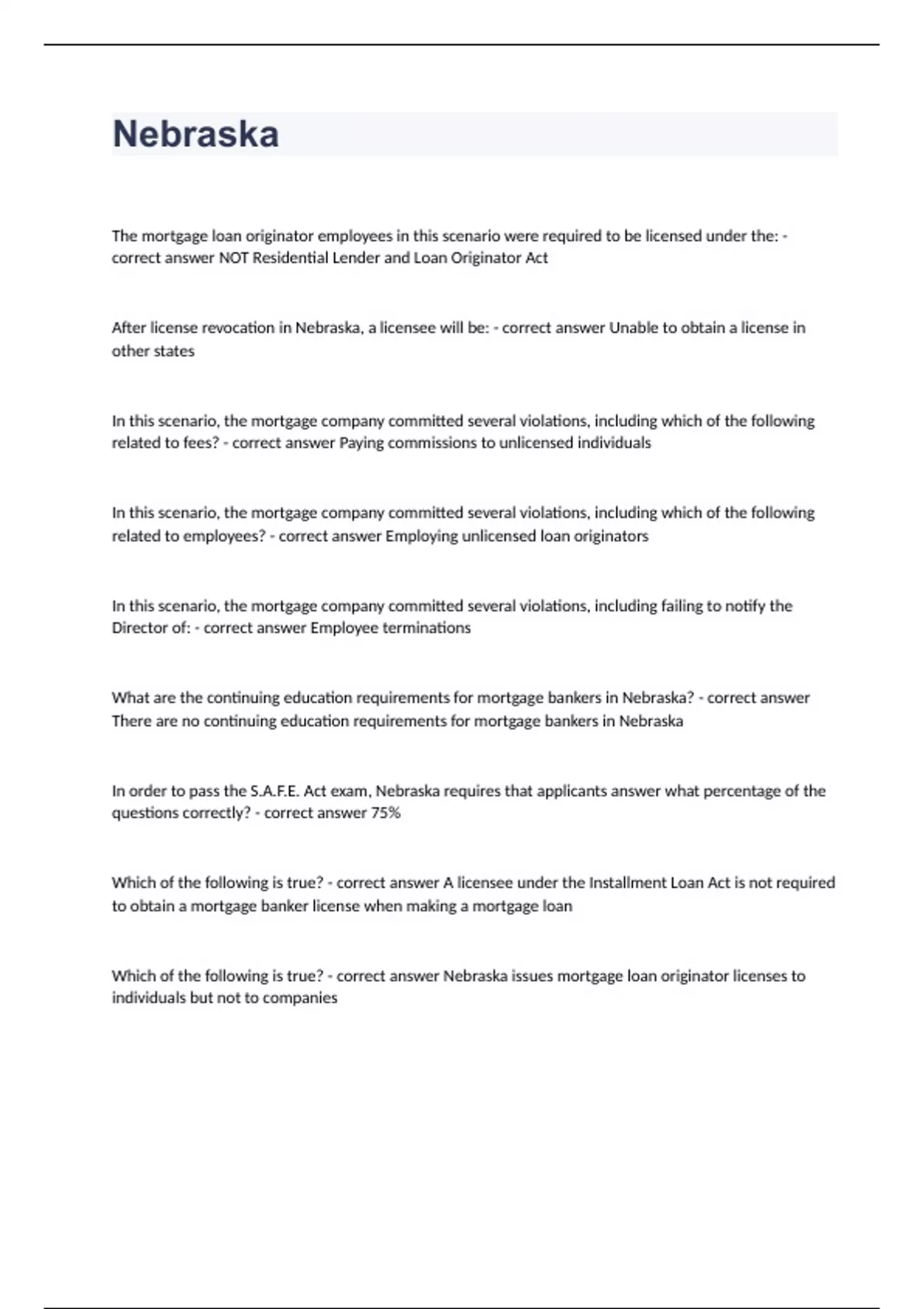 Nebraska The mortgage loan originator employees in this scenario were required to be licensed under the: - correct answer NOT Residential Lender and Loan Originator Act After license revocation in Nebraska, a licensee will be: - correct answer Unable to obtain a license in other states In this scenario, the mortgage company committed several violations, including which of the following related to fees? - correct answer Paying commissions to unlicensed individuals In this scenario, the mortgage company committed several violations, including which of the following related to employees? - correct answer Employing unlicensed loan originators In this scenario, the mortgage company committed several violations, including failing to notify the Director of: - correct answer Employee terminations What are the continuing education requirements for mortgage bankers in Nebraska? - correct answer There are no continuing education requirements for mortgage bankers in Nebraska In order to pass the S.A.F.E. Act exam, Nebraska requires that applicants answer what percentage of the questions correctly? - correct answer 75% Which of the following is true? - correct answer A licensee under the Installment Loan Act is not required to obtain a mortgage banker license when making a mortgage loan Which of the following is true? - correct answer Nebraska issues mortgage loan originator licenses to individuals but not to companies Which of the following is not true about surety bonds under the Residential Mortgage Licensing Act? - correct answer Mortgage loan originators are individually responsible for posting an initial surety bond of $100,000 Under the Residential Mortgage Licensing Act, who typically sponsors the mortgage loan originator? - correct answer The mortgage loan originator's employer sponsors him or her Mortgage loan originators must complete how many hours of continuing education annually? - correct answer 8 Under the Residential Mortgage Licensing Act, what is the obligation of a licensee if a criminal indictment is filed against the licensee? - correct answer The licensee has three business days to notify the Director in writing What is the purpose of the S.A.F.E. Mortgage Licensing Act? - correct answer To create a national database of mortgage professionals The consequence of failing the S.A.F.E. Act licensing exam three consecutive times is that licensees are forbidden from: - correct answer Taking it again for six months Which of the following is not a condition that must be met by mortgage loan originators when applying for a license under the Residential Mortgage Licensing Act? - correct answer Must never have been convicted of any misdemeanor Which of the following is not an obligation imposed on licensees under the Residential Mortgage Licensing Act? - correct answer Reduce fees for low-income borrowers What is the initial surety bond requirement under the Installment Loan Act if a licensee contracts with a mortgage loan originator? - correct answer NOT 50k NOT The bond depends on the number of loans generated after the first year Which of the following is true, according to the Statement on Subprime Mortgage Lending adopted by Nebraska? - correct answer Subprime loans are acceptable but predatory practices should be stopped