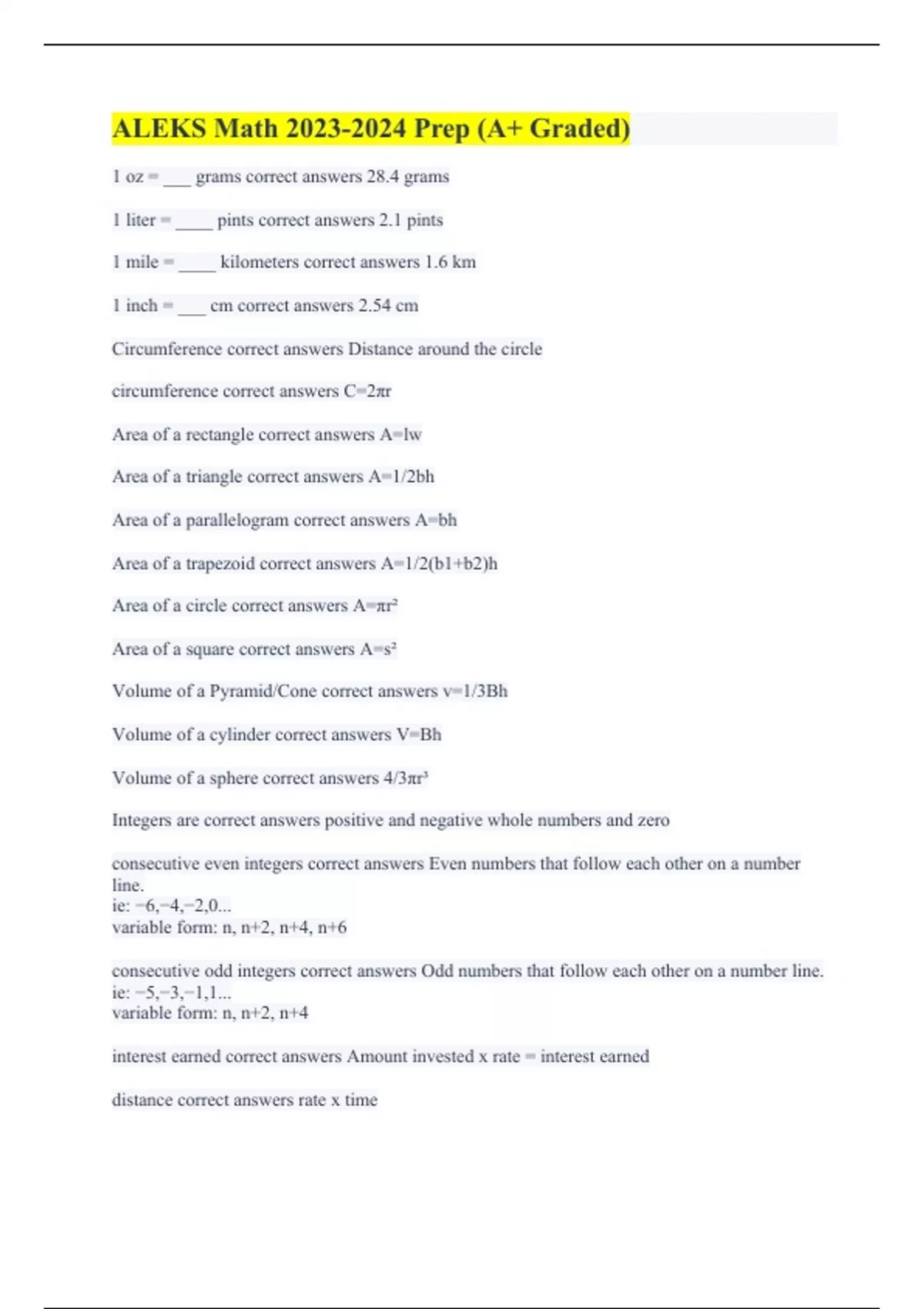 1 oz = ___ grams correct answers 28.4 grams 1 liter = ____ pints correct answers 2.1 pints 1 mile = ____ kilometers correct answers 1.6 km 1 inch = ___ cm correct answers 2.54 cm Circumference correct answers Distance around the circle circumference correct answers C=2πr Area of a rectangle correct answers A=lw Area of a triangle correct answers A=1/2bh Area of a parallelogram correct answers A=bh Area of a trapezoid correct answers A=1/2(b1+b2)h Area of a circle correct answers A=πr² Area of a square correct answers A=s² Volume of a Pyramid/Cone correct answers v=1/3Bh Volume of a cylinder correct answers V=Bh Volume of a sphere correct answers 4/3πr³ Integers are correct answers positive and negative whole numbers and zero consecutive even integers correct answers Even numbers that follow each other on a number line. ie: −6,−4,−2,0... variable form: n, n+2, n+4, n+6 consecutive odd integers correct answers Odd numbers that follow each other on a number line. ie: −5,−3,−1,1... variable form: n, n+2, n+4 interest earned correct answers Amount invested x rate = interest earned distance correct answers rate x time