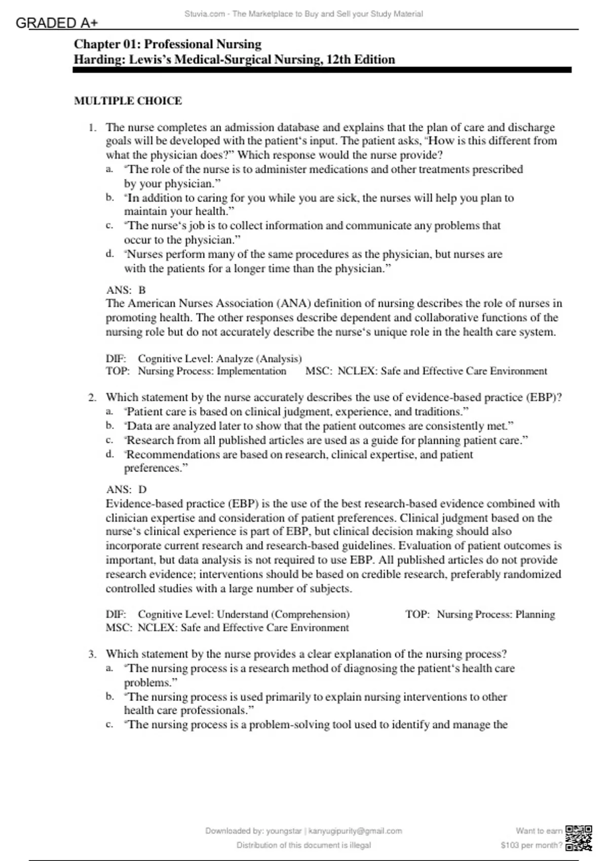 1. The nurse completes an admission database and explains that the plan of care and discharge goals will be developed with the patient‘s input. The patient asks, “How is this different from what the physician does?” Which response would the nurse provide? a. “The role of the nurse is to administer medications and other treatments prescribed by your physician.” b. “In addition to caring for you while you are sick, the nurses will help you plan to maintain your health.” c. “The nurse‘s job is to collect information and communicate any problems that occur to the physician.” d. “Nurses perform many of the same procedures as the physician, but nurses are with the patients for a longer time than the physician.” ANS: B The American Nurses Association (ANA) definition of nursing describes the role of nurses in promoting health. The other responses describe dependent and collaborative functions of the nursing role but do not accurately describe the nurse‘s unique role in the health care system. DIF: Cognitive Level: Analyze (Analysis) TOP: Nursing Process: Implementation MSC: NCLEX: Safe and Effective Care Environment 2. Which statement by the nurse accurately describes the use of evidence-based practice (EBP)? a. “Patient care is based on clinical judgment, experience, and traditions.” b. “Data are analyzed later to show that the patient outcomes are consistently met.” c. “Research from all published articles are used as a guide for planning patient care.” d. “Recommendations are based on research, clinical expertise, and patient preferences.” ANS: D Evidence-based practice (EBP) is the use of the best research-based evidence combined with clinician expertise and consideration of patient preferences. Clinical judgment based on the nurse‘s clinical experience is part of EBP, but clinical decision making should also incorporate current research and research-based guidelines. Evaluation of patient outcomes is important, but data analysis is not required to use EBP. All published articles do not provide research evidence; interventions should be based on credible research, preferably randomized controlled studies with a large number of subjects. DIF: Cognitive Level: Understand (Comprehension) TOP: Nursing Process: Planning MSC: NCLEX: Safe and Effective Care Environment 3. Which statement by the nurse provides a clear explanation of the nursing process? a. “The nursing process is a research method of diagnosing the patient‘s health care problems.” b. “The nursing process is used primarily to explain nursing interventions to other health care professionals.” c. “The nursing process is a problem-solving tool used to identify and manage the S - The Marketplace to Buy and Sell your Study Material Downloaded by: youngstar | Distribution of this document is illegal Want to earn $103 per month? GRADED A+ S - The Marketplace to Buy and Sell your Study Material patients‘ health care needs.” d. “The nursing process is based on nursing theory that incorporates the biopsychosocial nature of humans.” ANS: C The nursing process is a problem-solving approach to the identification and treatment of patients‘ problems. Nursing process does not require research methods for diagnosis. The primary use of the nursing process is in patient care, not to establish nursing theory or explain nursing interventions to other health care professionals. DIF: Cognitive Level: Understand (Comprehension) TOP: Nursing Process: Evaluation MSC: NCLEX: Safe and Effective Care Environment 4. A patient admitted to the hospital for surgery tells the nurse, “I do not feel comfortable leaving my children with my parents.” Which action would the nurse take next? a. Reassure the patient that these feelings are common for parents. b. Have the patient call the children to ensure that they are doing well. c. Gather information on the patient‘s concerns about the child care arrangements. d. Call the patient‘s parents to determine whether adequate child care is being provided. ANS: C Because a complete assessment is necessary in order to identify a problem and choose an appropriate intervention, the nurse‘s first action should be to obtain more information. The other actions may be appropriate, but more assessment is needed before the best intervention can be chosen. DIF: Cognitive Level: Analyze (Analysis) TOP: Nursing Process: Assessment MSC: NCLEX: Psychosocial Integrity 5. A patient with a bacterial infection is hypovolemic due to a fever and excessive diaphoresis. Which expected outcome would the nurse select for this patient? a. Patient has a balanced intake and output. b. Patient‘s bedding is kept clean and free of moisture. c. Patient understands the need for increased fluid intake. d. Patient‘s skin remains cool and dry throughout hospitalization. ANS: A Balanced intake and output gives measurable data showing resolution of the problem of deficient fluid volume. The other statements would not indicate that the problem of hypovolemia was resolved. DIF: Cognitive Level: Apply (Application) TOP: Nursing Process: Planning MSC: NCLEX: Physiological Integrity 6. Which statement describes the purpose of the evaluation phase of the nursing process? a. To document the nursing care plan in the progress notes of the health record b. To determine if interventions have been effective in meeting patient outcomes c. To decide whether the patient‘s health problems have been completely resolved d. To establish if the patient agrees that the nursing care provided was satisfactory ANS: B Downloaded by: youngstar | Distribution of this document is illegal Want to earn $103 per month? GRADED A+ S - The Marketplace to Buy and Sell your Study Material Evaluation consists of determining whether the desired patient outcomes have been met and whether the nursing interventions were appropriate. The other responses do not describe the evaluation phase. DIF: Cognitive Level: Understand (
