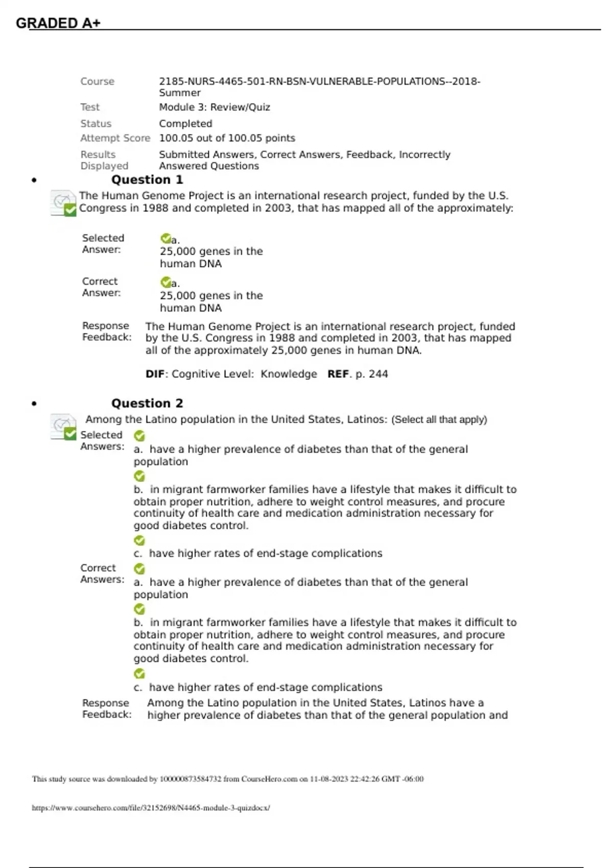 The Human Genome Project is an international research project, funded by the U.S. Congress in 1988 and completed in 2003, that has mapped all of the approximately: Selected Answer: a. 25,000 genes in the human DNA Correct Answer: a. 25,000 genes in the human DNA Response Feedback: The Human Genome Project is an international research project, funded by the U.S. Congress in 1988 and completed in 2003, that has mapped all of the approximately 25,000 genes in human DNA. DIF: Cognitive Level: Knowledge REF. p. 244 Question 2 Among the Latino population in the United States, Latinos: (Select all that apply) Selected Answers: a. have a higher prevalence of diabetes than that of the general population b. in migrant farmworker families have a lifestyle that makes it difficult to obtain proper nutrition, adhere to weight control measures, and procure continuity of health care and medication administration necessary for good diabetes control. c. have higher rates of end-stage complications Correct Answers: a. have a higher prevalence of diabetes than that of the general population b. in migrant farmworker families have a lifestyle that makes it difficult to obtain proper nutrition, adhere to weight control measures, and procure continuity of health care and medication administration necessary for good diabetes control. c. have higher rates of end-stage complications Response Feedback: Among the Latino population in the United States, Latinos have a higher prevalence of diabetes than that of the general population and This study source was downloaded by from CourseH on 11-08-2023 22:42:26 GMT -06:00 GRADED A+ a higher rate of end-stage complications. DIF. Cognitive Level: Knowledge REF. p. 757 Question 3 Depression and stress are areas of concern among adult migrants. This may be related to: (Select all that apply) Selected Answers: a. isolation b. economic hardship c. legal status d. weather conditions that interrup their work Correct Answers: a. isolation b. economic hardship c. legal status d. weather conditions that interrup their work Response Feedback: Depression and stress are areas of concern among adult migrants. This may be related to isolation, economic hardship, legal status, and weather conditions that interrupt their work. DIF. Cognitive Level: Knowledge REF. p. 757 Question 4 Factors that limit adequate provision of health care services to migrant population groups include: (Select all that apply) Selected Answers: a. lack of knowledge about services b. inability to afford care c. discrimination d. lack of fluency in English language Correct Answers: a. lack of knowledge about services b. inability to afford care This study source was downloaded by from CourseH on 11-08-2023 22:42:26 GMT -06:00 GRADED A+ c. discrimination d. lack of fluency in English language Response Feedback: Factors that limit adequate provision of health care services to migrant population groups include: lack of knowledge about services, inability to afford care, discrimination, and lack of fluency in English language. DIF. Cognitive Level: Knowledge REF. pp. 754-755 Question 5 Healthy People 2020 discusses vulnerable population groups and identifies illness prevention and health promotion objectives for them. One of the four goals of Healthy People 2020 is the elimination of: Selected Answer: c. Health disparities Correct Answer: c. Health disparities Response Feedback: Healthy People 2020 discusses vulnerable population groups and identifies illness prevention and health promotion objectives for them. One of the four goals of Healthy People 2020 is the elimination of health disparities. DIF. Cognitive Level: Knowledge REF. p. 717 Question 6 Key findings from early work to sequence the human genome were that: (Select all that apply) Selected Answers: a. all humans are 99.9% identical at the DNA level d. nearly 25,000 genes make up the human genome Correct Answers: a. all humans are 99.9% identical at the DNA level d. nearly 25,000 genes make up the human genome Response Feedback: Key finding from early work to sequence the human genome were that all humans are 99.9% identical at the DNA level,and nearly 25,000 genes make up the human genome. DIF: Cognitive Level: Knowledge REF. p. 244 Question 7 A migrant worker is a laborer whose principal employment involves: (Select all that apply) This study source was downloaded by from CourseH on 11-08-2023 22:42:26 GMT -06:00 GRADED A+ Selected Answers: a. moving from a home base to another location b. planting or harvesting agricultural products c. living in temporary housing Correct Answers: a. moving from a home base to another location b. planting or harvesting agricultural products c. living in temporary housing Response Feedback: A migrant worker is a laborer whose principal employment involves moving from a home base to another location, planting or harvesting agricultural products, and living in temporary housing.