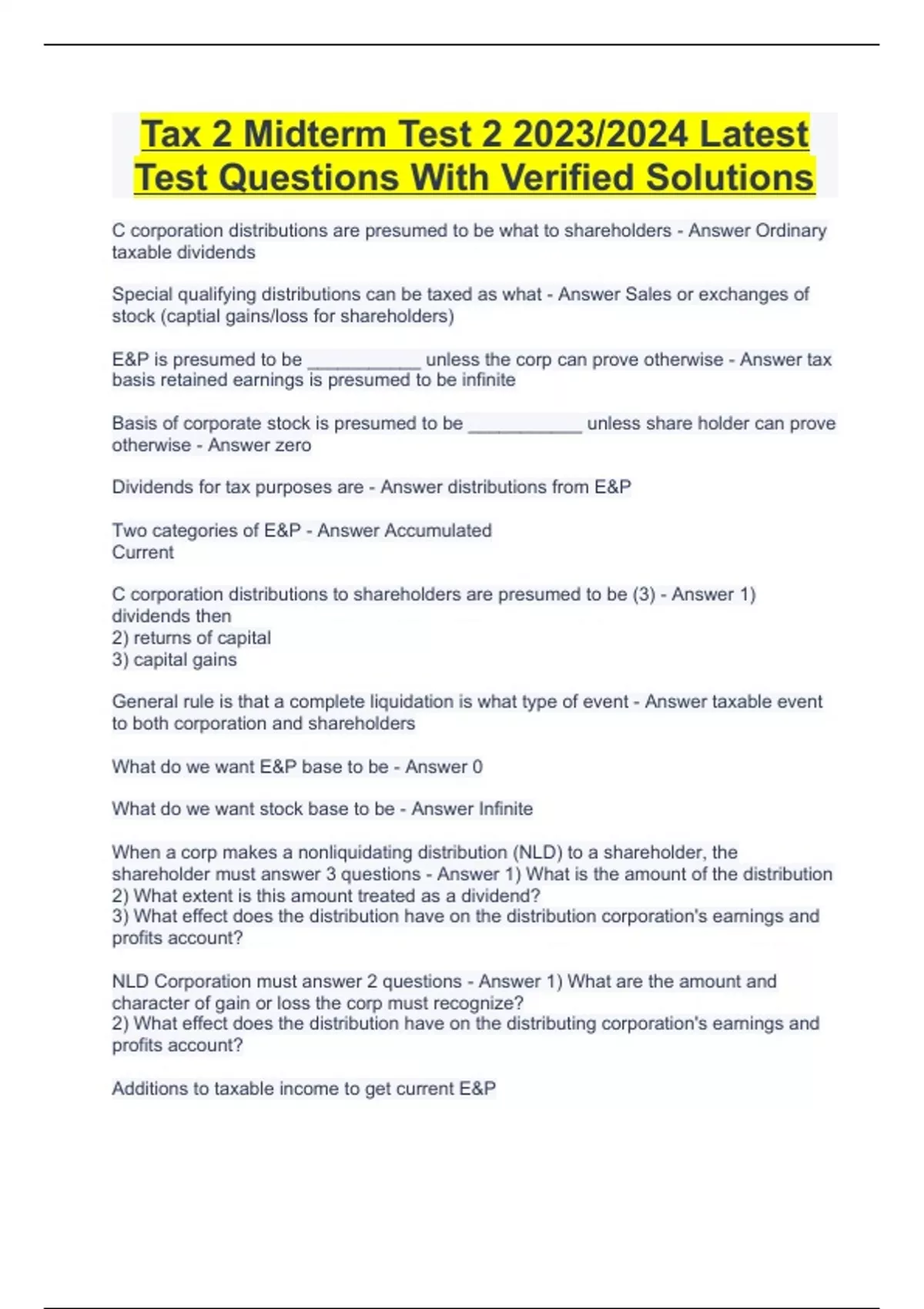 Tax 2 Midterm Test 2 2023/2024 Latest Test Questions With Verified Solutions