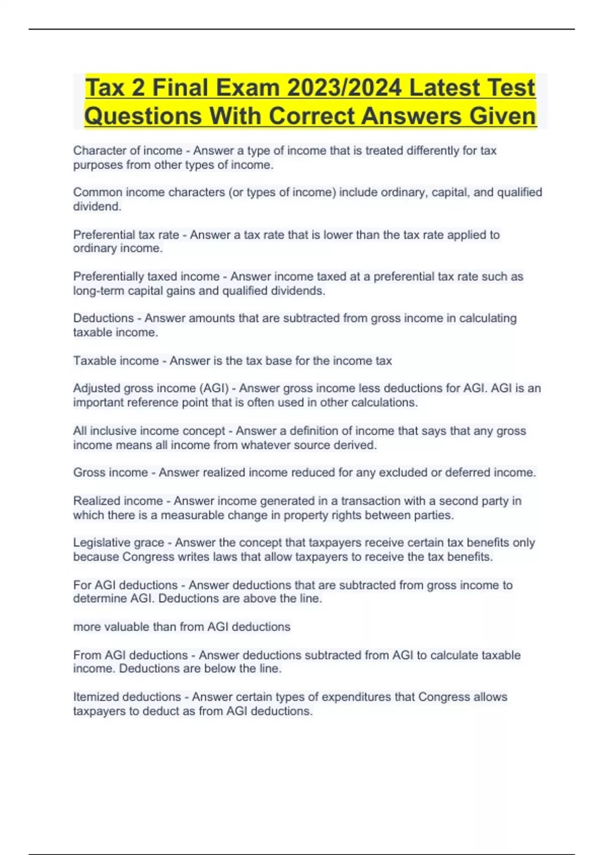 Tax 2 Final Exam 2023/2024 Latest Test Questions With Correct Answers Given