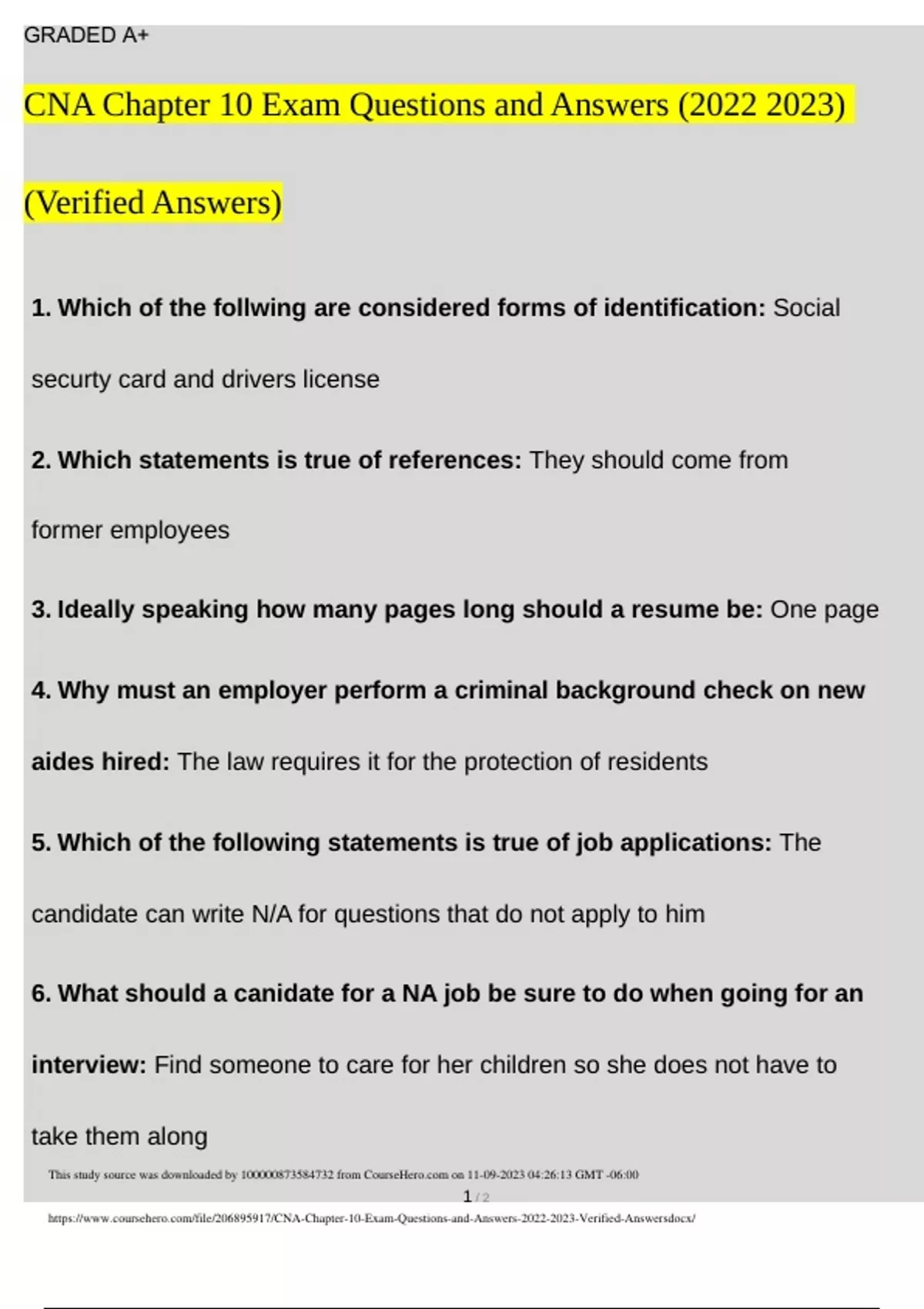 1. Which of the follwing are considered forms of identification: Social securty card and drivers license 2. Which statements is true of references: They should come from former employees 3. Ideally speaking how many pages long should a resume be: One page 4. Why must an employer perform a criminal background check on new aides hired: The law requires it for the protection of residents 5. Which of the following statements is true of job applications: The candidate can write N/A for questions that do not apply to him 6. What should a canidate for a NA job be sure to do when going for an interview: Find someone to care for her children so she does not have to take them along 1 / 2 This study source was downloaded by from CourseH on :26:13 GMT -06:00 GRADED A+ 7. Which of the following Would be the least appropriate thing to say to a potential employer when interviewing for a job: I left my last job be my boss was always critizijng me even though I wasn't doing anything wrong 8. Which of the following is one reason a job description is important: It can reduce misunderstandings between the NA and her employer about the NAs job duties 9. The best response an NA can give to hostile criticism is: I'm sorry your disappointed 10. Which of the following is a tip regarding appropriate body language to use when resolving conflict: Maintaining eye contact and lean forward slightly 11. Which of these statements is an example of constructive criticism: You really need to remember to speak kindly to the residents, even when you're having a hard day 2 / 2 This study source was downloaded by from CourseH on :26:13 GMT -06:00 GRADED A+ 12. Which department often maintains a states NA registry: Department of health 13. The federal government requires that NAs have _ hours of continuing education each year: 12 14. Which of the following is true of stress: When a person recognizes stress, he can use simple methods to help manage it 15. Which of the following is a guideline for managing stress appropriately- : Get enough sleep