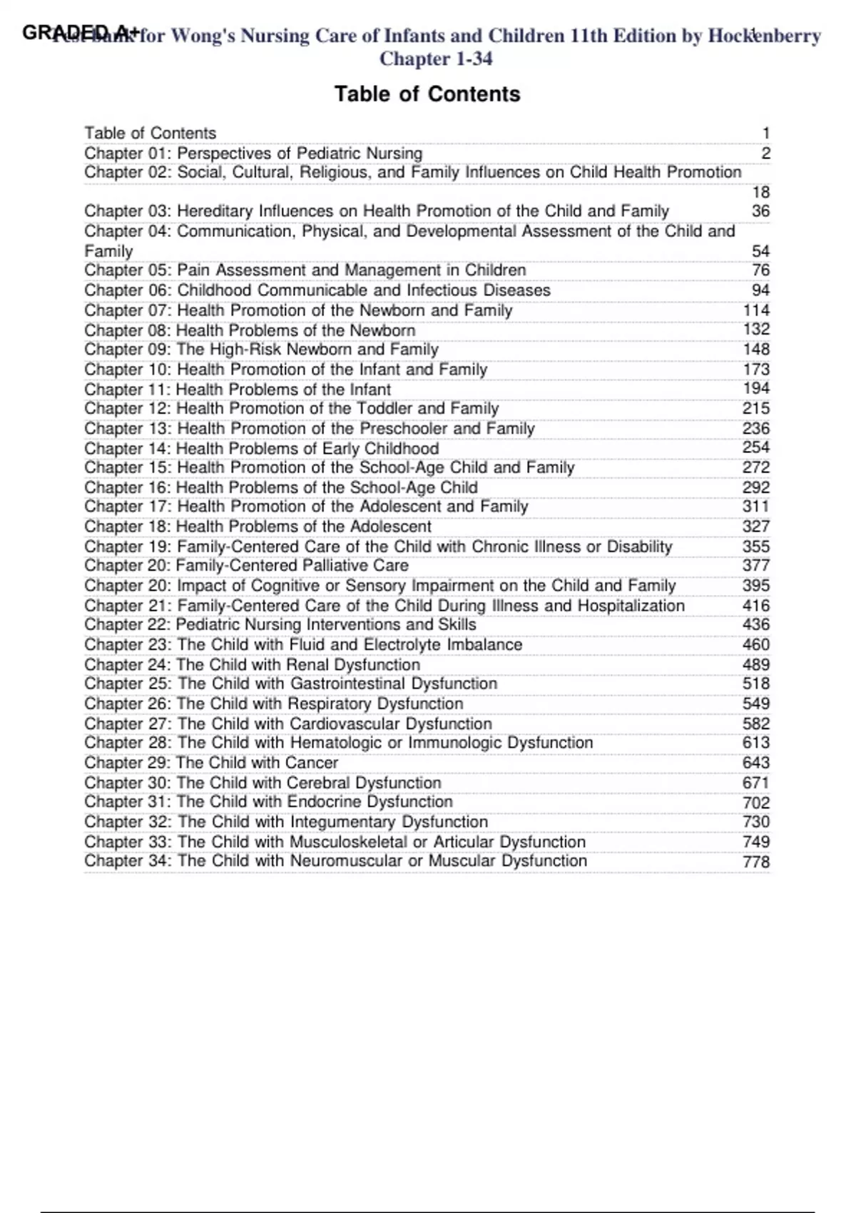 1. The clinic nurse is reviewing statistics on infant mortality for the United States versus other countries. Compared with other countries that have a population of at least 25 million, the nurse makes which determination? a. The United States is ranked last among 27 countries. b. The United States is ranked similar to 20 other developed countries. c. The United States is ranked in the middle of 20 other developed countries. d. The United States is ranked highest among 27 other industrialized countries. ANS: A Although the death rate has decreased, the United States still ranks last in infant mortality among nations with a population of at least 25 million. The United States has the highest infant death rate of developed nations. DIF: Cognitive Level: Remembering TOP: Nursing Process: Assessment MSC: Client Needs: Health Promotion and Maintenance 2. Which is the leading cause of death in infants younger than 1 year in the United States? a. Congenital anomalies b. Sudden infant death syndrome c. Disorders related to short gestation and low birth weight d. Maternal complications specific to the perinatal period ANS: A Congenital anomalies account for 20.1% of deaths in infants younger than 1 year compared with sudden infant death syndrome, which accounts for 8.2%; disorders related to short gestation and unspecified low birth weight, which account for 16.5%; and maternal complications such as infections specific to the perinatal period, which account for 6.1% of deaths in infants younger than 1 year of age. DIF: Cognitive Level: Remembering MSC: Client Needs: Health Promotion and Maintenance 3. What is the major cause of death for children older than 1 year in the United States? a. Heart disease GRADED A+ Test bank for Wong's Nursing Care of Infants and Children 11th Edition by Hockenberry Chapter 1-34 3 b. Childhood cancer c. Unintentional injuries d. Congenital anomalies ANS: C Unintentional injuries (accidents) are the leading cause of death after age 1 year through adolescence. The leading cause of death for those younger than 1 year is congenital anomalies, and childhood cancers and heart disease cause a significantly lower percentage of deaths in children older than 1 year of age. DIF: Cognitive Level: Understanding MSC: Client Needs: Health Promotion and Maintenance 4. In addition to injuries, what are the leading causes of death in adolescents ages 15 to 19 years? a. Suicide and cancer b. Suicide and homicide c. Drowning and cancer d. Homicide and heart disease ANS: B Suicide and homicide account for 16.7% of deaths in this age group. Suicide and cancer account for 10.9% of deaths, heart disease and cancer account for approximately 5.5%, and homicide and heart disease account for 10.9% of the deaths in this age group. DIF: Cognitive Level: Remembering MSC: Client Needs: Health Promotion and Maintenance 5. The nurse is planning a teaching session to adolescents about deaths by unintentional injuries. Which should the nurse include in the session with regard to deaths caused by injuries? a. More deaths occur in males. b. More deaths occur in females. c. The pattern of deaths does not vary according to age and sex. d. The pattern of deaths does not vary widely among different ethnic groups. ANS: A The majority of deaths from unintentional injuries occur in males. The pattern of death does vary greatly GRADED A+ Test bank for Wong's Nursing Care of Infants and Children 11th Edition by Hockenberry Chapter 1-34 4 among different ethnic groups, and the causes of unintentional deaths vary with age and gender. DIF: Cognitive Level: Applying TOP: Integrated Process: Teaching/Learning MSC: Client Needs: Health Promotion and Maintenance 6. What do mortality statistics describe? a. Disease occurring regularly within a geographic location b. The number of individuals who have died over a specific period c. The prevalence of specific illness in the population at a particular time d. Disease occurring in more than the number of expected casesin a community ANS: B Mortality statistics refer to the number of individuals who have died over a specific period. Morbidity statistics show the prevalence of specific illness in the population at a particular time. Data regarding disease within a geographic region, or in greater than expected numbers in a community, may be extrapolated from analyzing the morbidity statistics. DIF: Cognitive Level: Remembering MSC: Client Needs: Health Promotion and Maintenance 7. The nurse should assess which age group for suicide ideation since suicide in which age group is the third leading cause of death? a. Preschoolers b. Young school age c. Middle school age d. Late school age and adolescents ANS: D Suicide is the third leading cause of death in children ages 10 to 19 years; therefore, the age group should be late school age and adolescents. Suicide is not one of the leading causes of death for preschool and young or middle school-aged children. DIF: Cognitive Level: Understanding TOP: Nursing Process: Assessment MSC: Client Needs: Health Promotion and Maintenance
