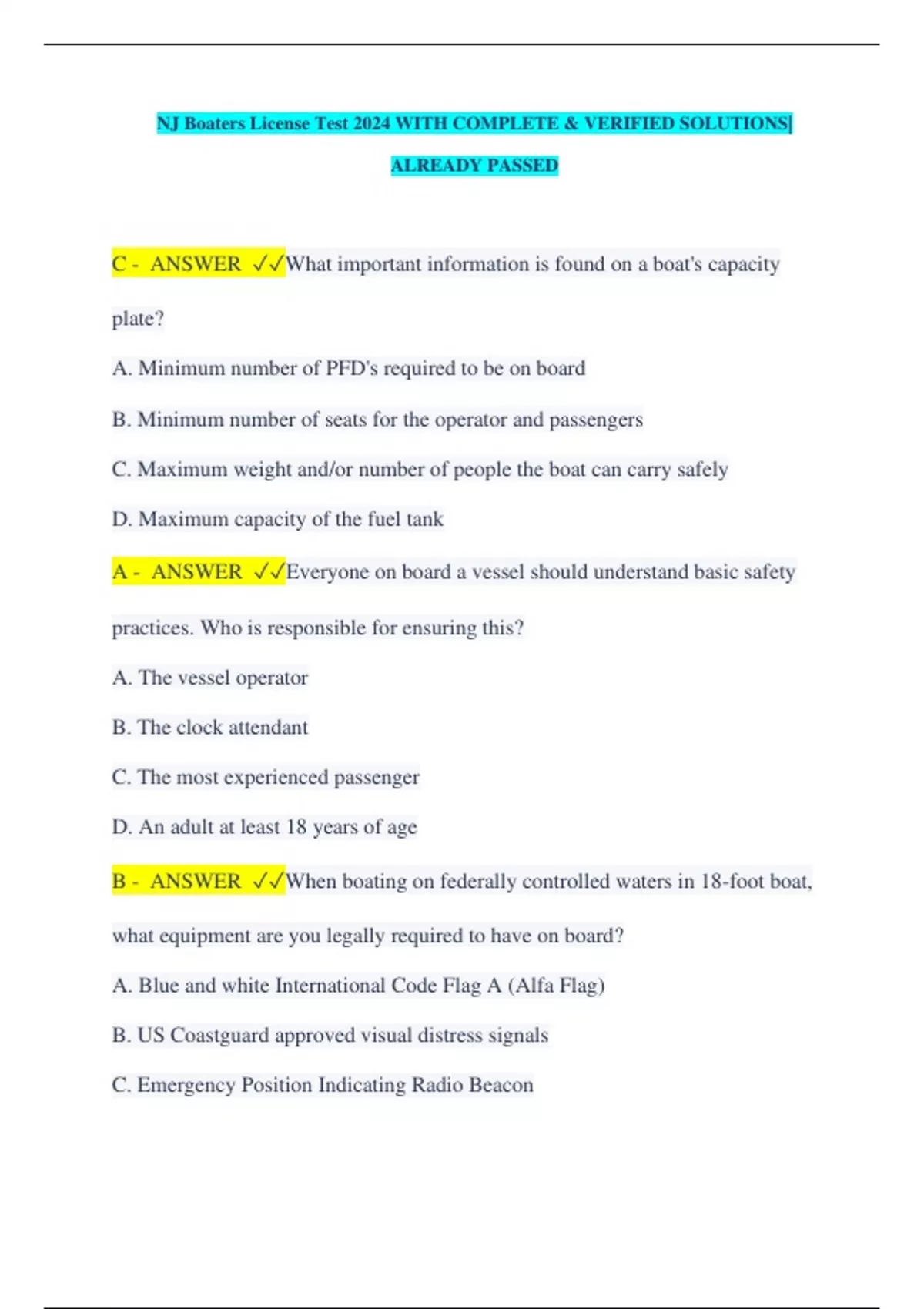 NJ Boaters License Test 2024 WITH COMPLETE & VERIFIED SOLUTIONS| ALREADY PASSED C - ANSWER What important information is found on a boat's capacity plate? A. Minimum number of PFD's required to be on board B. Minimum number of seats for the operator and passengers C. Maximum weight and/or number of people the boat can carry safely D. Maximum capacity of the fuel tank A - ANSWER Everyone on board a vessel should understand basic safety practices. Who is responsible for ensuring this? A. The vessel operator B. The clock attendant C. The most experienced passenger D. An adult at least 18 years of age B - ANSWER When boating on federally controlled waters in 18-foot boat, what equipment are you legally required to have on board? A. Blue and white International Code Flag A (Alfa Flag) B. US Coastguard approved visual distress signals C. Emergency Position Indicating Radio Beacon D. Compass and map A - ANSWER How should you approach the dock when docking your vessel? A. against the wind or current, whichever is stronger B. With the wind or current, whichever is stronger C. At regular operating speed without slowing down D. Between other vessels in heavy traffic D - ANSWER Which of the following is an example of careless operation and may be the reason that a boat operator is directed by an officer to return to shore? A. Displaying navigation lights in fog B. Not having enough fuel in the bilges C. Having personal flotation devices that are wrong D. Not having enough personal flotation devices on board A - ANSWER What is the main function of an ignition safety switch? A. To shut off the engine if the operator is thrown overboard B. To shut off the engine when the PWC or boat is beached C. To prevent the operation by unauthorized persons D. To prevent theft when the PWC or boat is left unattended A - ANSWER When two vessels are operating in the same general area, who is responsible for avoiding a collisi