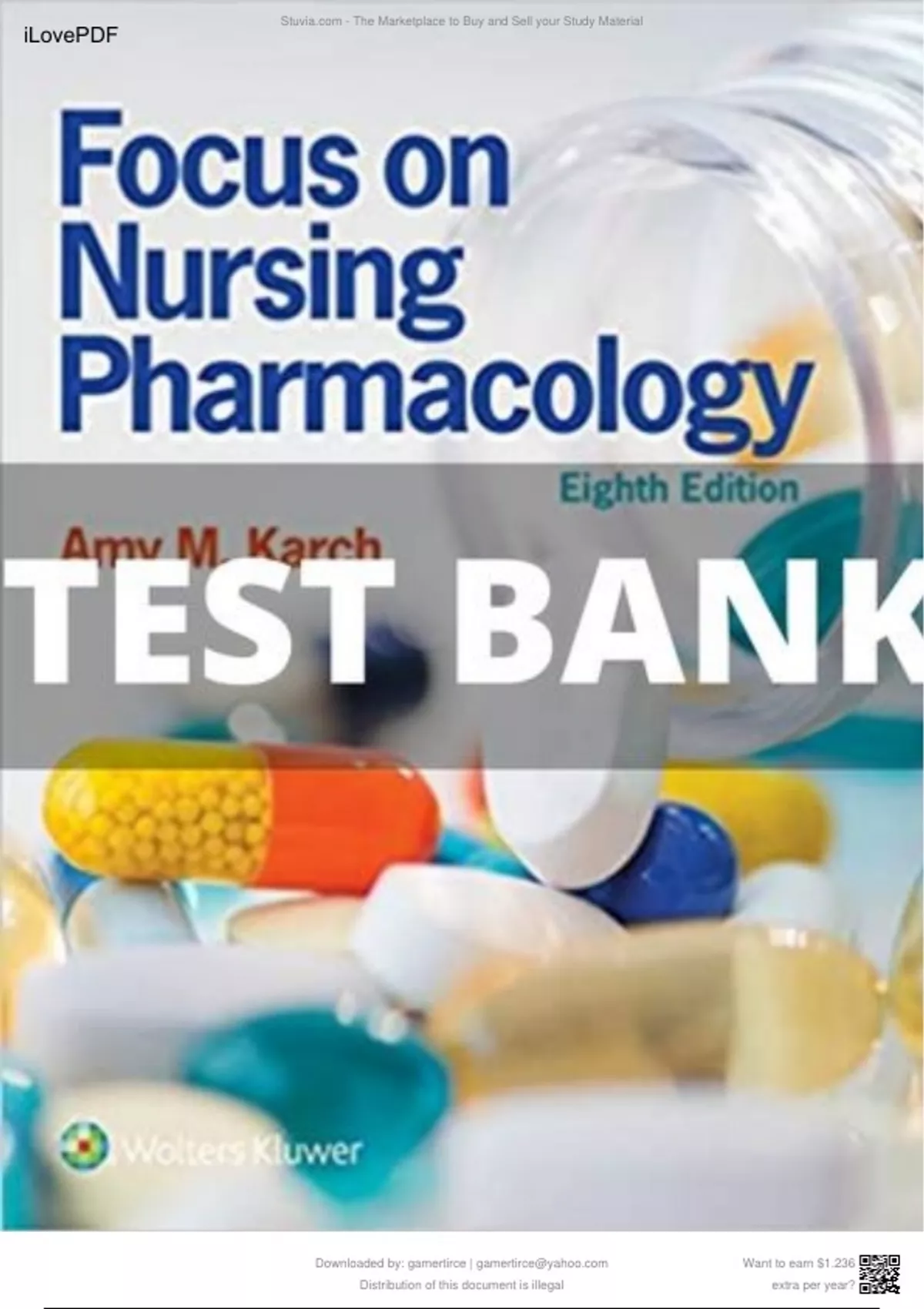A nurse working in radiology administers iodine to a patient who is having a computed tomography(CT) scan. The nurse working on the oncology unit administers chemotherapy to patients who have cancer. At the Public Health Department, a nurse administers a measles-mumps-rubella (MMR) vaccine to a 14-month-old child as a routine immunization. Which branch of pharmacology best describes the actions of all three nurses? Pharmacoeconomics Pharmacotherapeutics Pharmacodynamics Pharmacokinetics Ans: B Feedback: Pharmacology is the study of the biologic effects of chemicals. Nurses are involved with clinical pharmacology or pharmacotherapeutics, which is a branch of pharmacology that deals with the uses of drugs to treat, prevent, and diagnose disease. The radiology nurse is administering a drug to help diagnose a disease. The oncology nurse is administering a drug to help treat a disease. Pharmacoeconomics includes any costs involved in drug therapy. Pharmacodynamics involves how a drug affects the body and pharmacokinetics is how the body acts on the body. A physician has ordered intramuscular (IM) injections of morphine, a narcotic, every 4 hours as neededfor pain in a motor vehicle accident victim. The nurse is aware this drug has a high abuse potential. Under what category would morphine be classified? Schedule I Schedule II Schedule III Schedule IV Ans: B Feedback: Narcotics with a high abuse potential are classified as Schedule II drugs because of severe dependence Downloaded by: gamertirce | Distribution of this document is illegal Want to earn $1.236 extra per year? iLovePDF S - The Marketplace to Buy and Sell your Study Material Test Bank - Focus on Nursing Pharmacology (8th Edition by Karch) 4 liability. Schedule I drugs have high abuse potential and no accepted medical use. Schedule III drugs have a lesser abuse potential than II and an accepted medical use. Schedule IV drugs have low abuse potential and limited dependence liability. When involved in phase III drug evaluation studies, what responsibilities would the nurse have? Working with animals who are given experimental drugs Choosing appropriate patients to be involved in the drug study Monitoring and observing patients closely for adverse effects Conducting research to determine effectiveness of the drugAns: C Feedback: Phase III studies involve use of a drug in a vast clinical population in which patients are asked to record any symptoms they experience while taking the drugs. Nurses may be responsible for helping collect and analyze the information to be shared with the Food and Drug Administration (FDA) but would not conduct research independently because nurses do not prescribe medications. Use of animals in drug testing is done in the preclinical trials. Select patients who are involved in phase II studies to participate in studies where the participants have the disease the drug is intended to treat. These patients are monitored closely for drug action and adverse effects. Phase I studies involve healthy human volunteers who are usually paid for their participation. Nurses may observe for adverse effects and toxicity. What concept is considered when generic drugs are substituted for brand name drugs? Bioavailability Critical concentration Distribution Half-life Ans: A Feedback: Bioavailability is the portion of a dose of a drug that reaches the systemic circulation and is available to act on body cells. Binders used in a generic drug may not be the same as those used in the brand name drug. Therefore, the way the body breaks down and uses the drug may differ, which may eliminate a generic drug substitution. Critical concentration is the amount of a drug that is needed to cause a therapeutic effect and should not differ between generic and brand name medications. Distribution is the phase of pharmacokinetics, which involves the movement of a drug to the body’s tissues and is the Downloaded by: gamertirce | Distribution of this document is illegal Want to earn $1.236 extra per year? iLovePDF S - The Marketplace to Buy and Sell your Study Material Test Bank - Focus on Nursing Pharmacology (8th Edition by Karch) 5 same in generic and brand name drugs. A drug’s half-life is the time it takes for the amount of drug to decrease to half the peak level, which should not change when substituting a generic medication. A nurse is assessing the patient’s home medication use. After listening to the patient list current medications, the nurse asks what priority question? Do you take any generic medications? Are any of these medications orphan drugs? Are these medications safe to take during pregnancy? Do you take any over-the-counter medications? Ans: D Feedback: It is important for the nurse to specifically question use of over-the-counter medications because patients may not consider them important. The patient is unlikely to know the meaning of orphan drugs unless they too are health care providers. Safety during pregnancy, use of a generic medication, or classification of orphan drugs are things the patient would be unable to answer but could be found in reference books if the nurse wishes to research them. After completing a course on pharmacology for nurses, what will the nurse know? Everything necessary for safe and effective medication administration Current pharmacologic therapy; the nurse will not require ongoing education for 5 years. General drug information; the nurse can consult a drug guide for specific drug information. The drug actions that are associated with each classification of medicationAns: C Feedback: After completing a pharmacology course nurses will have general drug information needed for safe and effective medication administration but will need to consult a drug guide for specific drug information before administering any medication. Pharmacology is constantly changing, with new drugs entering the market and new uses for existing drugs identified. Continuing education in pharmacology is essential to s