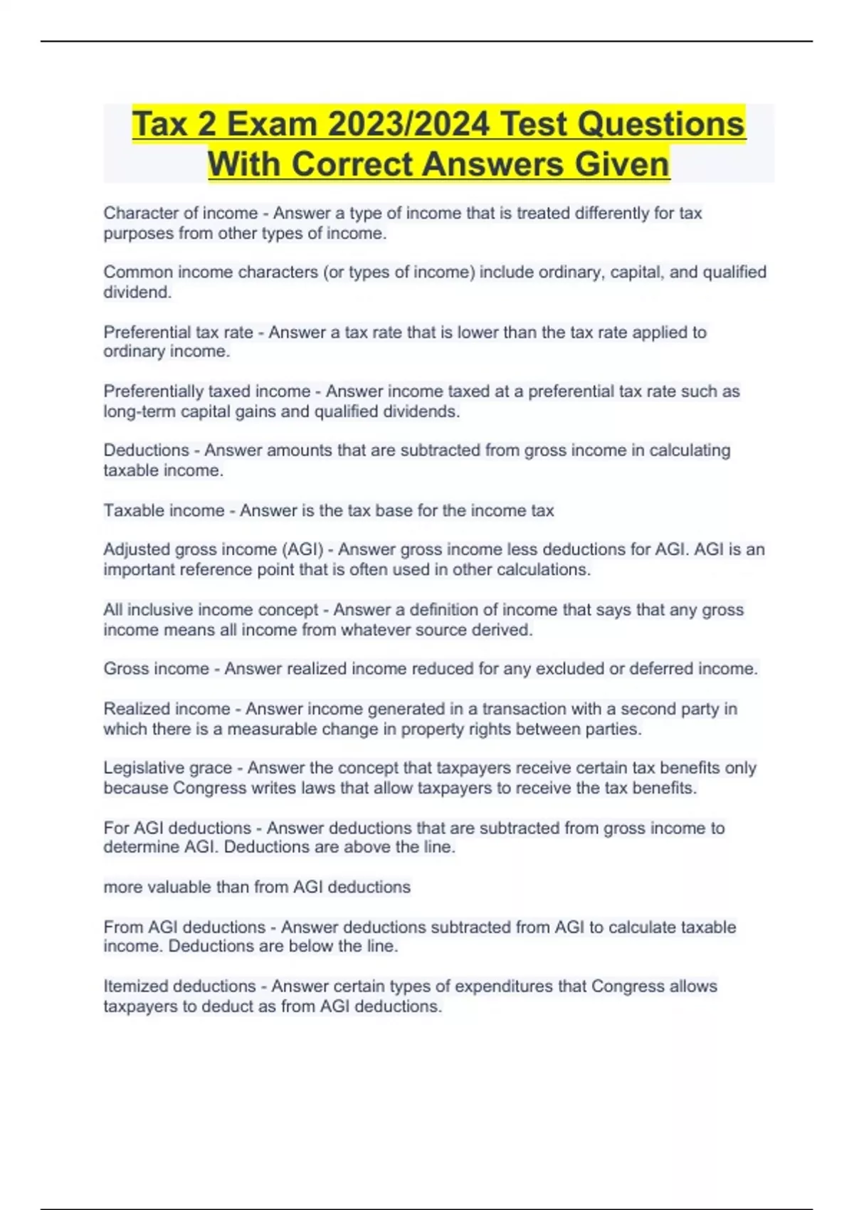 Tax 2 Exam 2023/2024 Test Questions