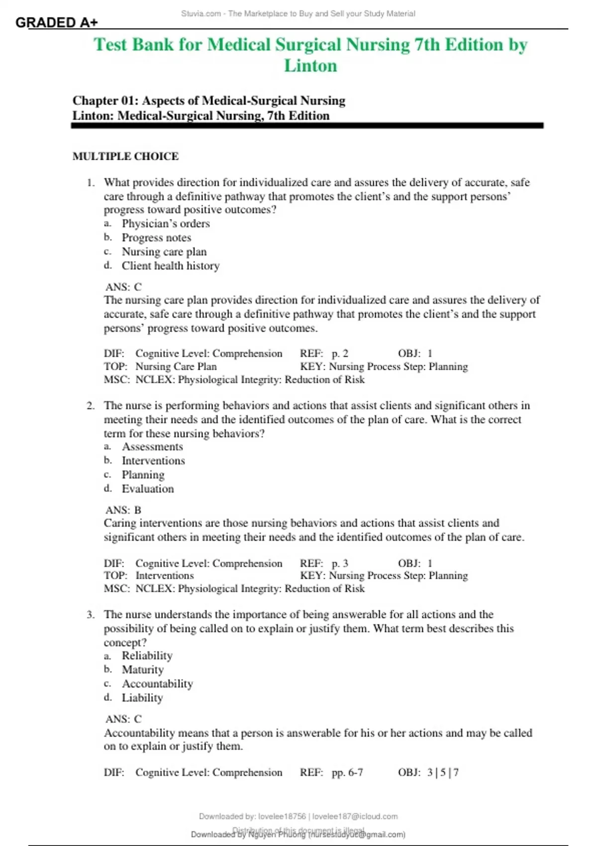 Test Bank for Medical Surgical Nursing 7th Edition by Linton Chapter 01: Aspects of Medical-Surgical Nursing Linton: Medical-Surgical Nursing, 7th Edition MULTIPLE CHOICE 1. What provides direction for individualized care and assures the delivery of accurate, safe care through a definitive pathway that promotes the client’s and the support persons’ progress toward positive outcomes? a. Physician’s orders b. Progress notes c. Nursing care plan d. Client health history ANS: C The nursing care plan provides direction for individualized care and assures the delivery of accurate, safe care through a definitive pathway that promotes the client’s and the support persons’ progress toward positive outcomes. DIF: Cognitive Level: Comprehension REF: p. 2 OBJ: 1 TOP: Nursing Care Plan KEY: Nursing Process Step: Planning MSC: NCLEX: Physiological Integrity: Reduction of Risk 2. The nurse is performing behaviors and actions that assist clients and significant others in meeting their needs and the identified outcomes of the plan of care. What is the correct term for these nursing behaviors? a. Assessments b. Interventions c. Planning d. Evaluation ANS: B Caring interventions are those nursing behaviors and actions that assist clients and significant others in meeting their needs and the identified outcomes of the plan of care. DIF: Cognitive Level: Comprehension REF: p. 3 OBJ: 1 TOP: Interventions KEY: Nursing Process Step: Planning MSC: NCLEX: Physiological Integrity: Reduction of Risk 3. The nurse understands the importance of being answerable for all actions and the possibility of being called on to explain or justify them. What term best describes this concept? a. Reliability b. Maturity c. Accountability d. Liability ANS: C Accountability means that a person is answerable for his or her actions and may be called on to explain or justify them. DIF: Cognitive Level: Comprehension REF: pp. 6-7 OBJ: 3 | 5 | 7 S - The Marketplace to Buy and Sell your Study Material Downloaded by: lovelee18756 | Distribution of this document is illegal Downloaded by Nguyen Phuong () lOMoARcPSD| GRADED A+ S - The Marketplace to Buy and Sell your Study Material TOP: Accountability KEY: Nursing Process Step: N/A MSC: NCLEX: Physiological Integrity: Reduction of Risk MULTIPLE RESPONSE 1. The nurse manager is providing an inservice about conflict resolution. What modes of conflict resolution should be addressed? (Select all that apply.) a. Suppression b. Accommodation c. Compromise d. Avoidance e. Collaboration f. Competition ANS: B, C, D, E, F The modes of conflict resolution include accommodation, collaboration, compromise, avoidance, and competition. DIF: Cognitive Level: Knowledge REF: p. 7|p. 8|Table 1.1 OBJ: 7 TOP: Conflict Resolution KEY: Nursing Process Step: N/A MSC: NCLEX: N/A 2. What are the characteristics of an effective leader? (Select all that apply.) a. Effective communication b. Rigid rules and regulations c. Delegates appropriately d. Acts as a role model e. Consistently handles conflict f. Focuses on individual development ANS: A, C, D, E Characteristics of an effective leader include effective communication, consistency in managing conflict, knowledge and competency in all aspects of delivery of care, effective role model for staff, uses participatory approach in decision making, shows appreciation for a job well done, delegates work appropriately, sets objectives and guides staff, displays caring, understanding, and empathy for others, motivates and empowers others, is proactive and flexible, and focuses on team development. DIF: Cognitive Level: Comprehension REF: p. 6 OBJ: 5 TOP: Leadership KEY: Nursing Process Step: N/A MSC: NCLEX: N/A COMPLETION 1. is defined as the process by which information is exchanged between individuals verbally, nonverbally, and/or in writing or through information technology. ANS: Communication Downloaded by: lovelee18756 | Distribution of this document is illegal Downloaded by Nguyen Phuong () lOMoARcPSD| GRADED A+ S - The Marketplace to Buy and Sell your Study Material Communication is defined as the process by which information is exchanged between individuals verbally, nonverbally, and/or in writing or through information technology. DIF: Cognitive Level: Knowledge REF: p. 2 OBJ: 2 TOP: Communication KEY: Nursing Process Step: N/A MSC: NCLEX: N/A 2. is the collection and processing of relevant data for the purpose of appraising the client’s health status. ANS: Assessment Assessment is the collection and processing of relevant data for the purpose of appraising the client’s health status. DIF: Cognitive Level: Knowledge REF: p. 2 OBJ: 1 | 2 TOP: Assessment KEY: Nursing Process Step: N/A MSC: NCLEX: N/A 3. is concerned with the ethical questions that arise in the context of health care. ANS: Bioethics Bioethics is concerned with the ethical questions that arise in the context of health care. DIF: Cognitive Level: Knowledge REF: p. 4 OBJ: 3 TOP: Bioethics KEY: Nursing Process Step: N/A MSC: NCLEX: N/A 4. Place the corresponding letter to each stage of conflict in the correct order. (Place the events in the appropriate sequence with capital letters. Do not separate answers with a space or punctuation. Example: ABCD.) a. Outcomes b. Conceptualization c. Frustration d. Action ANS: CBDA The stages of conflict in order are frustration, conceptualization, action, and outcomes. DIF: Cognitive Level: Comprehension REF: p. 7 OBJ: 7 TOP: Conflict KEY: Nursing Process Step: N/A MSC: NCLEX: N/A 5. Place the corresponding letter to each key step in solving an ethical dilemma in the correct order. (Place the events in the appropriate sequence. Do not separate answers with a space or punctuation. Example: ABCD.) a. Negotiate a plan. b. Clarify values. c. Ask if it is an ethical dilemma. Downloaded by: lovelee18756 | Distribution of this document is illegal Downloaded by Nguyen Phuong () lOMoARcPSD| GRADED A+ S - The Marketplace to Buy and Sell your Study Material d. Verbaliz
