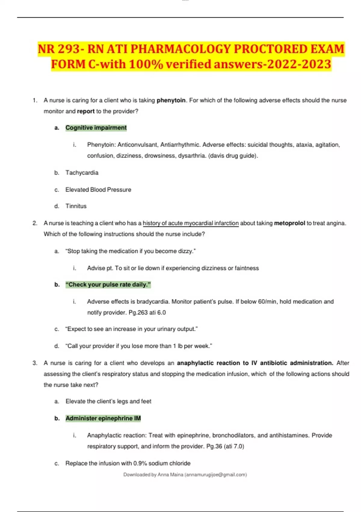 NR 293- RN ATI PHARMACOLOGY PROCTORED EXAM FORM C-with 100% verified answers- 1. A nurse is caring for a client who is taking phenytoin. For which of the following adverse effects should the nurse monitor and report to the provider? a. Cognitive impairment i. Phenytoin: Anticonvulsant, Antiarrhythmic. Adverse effects: suicidal thoughts, ataxia, agitation, confusion, dizziness, drowsiness, dysarthria. (davis drug guide). b. Tachycardia c. Elevated Blood Pressure d. Tinnitus 2. A nurse is teaching a client who has a history of acute myocardial infarction about taking metoprolol to treat angina. Which of the following instructions should the nurse include? a. “Stop taking the medication if you become dizzy.” i. Advise pt. To sit or lie down if experiencing dizziness or faintness b. “Check your pulse rate daily.” i. Adverse effects is bradycardia. Monitor patient’s pulse. If below 60/min, hold medication and notify provider. Pg.263 ati 6.0 c. “Expect to see an increase in your urinary output.” d. “Call your provider if you lose more than 1 lb per week.” 3. A nurse is caring for a client who develops an anaphylactic reaction to IV antibiotic administration. After assessing the client’s respiratory status and stopping the medication infusion, which of the following actions should the nurse take next? a. Elevate the client’s legs and feet b. Administer epinephrine IM i. Anaphylactic reaction: Treat with epinephrine, bronchodilators, and antihistamines. Provide respiratory support, and inform the provider. Pg.36 (ati 7.0) c. Replace the infusion with 0.9% sodium chloride lOMoAR cPSD| Downloaded by Anna Maina () d. Give diphenhydramine IM lOMoAR cPSD| Downloaded by Anna Maina () 4. A nurse is assessing a client who is receiving oxytocin via continuous IV infusion for labor augmentation. The nurse notes six contractions in a 10-min period with a nonreassuring FHR. Which of the following actions should the nurse take first? a. Administer terbutaline 0.25mg subq b. Discontinue the oxytocin IV infusion c. Turn the client to her left side d. Apply O2 at 10L/min via face mask 5. A nurse is preparing to administer lactated ringer’s solution at 100ml/hr. The drop factor of the manual IV tubing is 15gtt/mL. The nurse should set the manual IV infusion to deliver how many gtt/min? (Round the answer to the nearest whole number. Use a leading zero if it applies. Do not use a trailing zero.) a. (100 mL/hr)(15 gtt/mL) = 1500 gtt/hr /60min= 25 gtt/min 6. A client who has active tuberculosis and is taking rifampin reports that his urine and sweat have developed a red-orange tinge. Which of the following actions should the nurse take? a. Prepare the client for dialysis b. Instruct the client to increase his fluid intake c. Check the client’s liver function test result