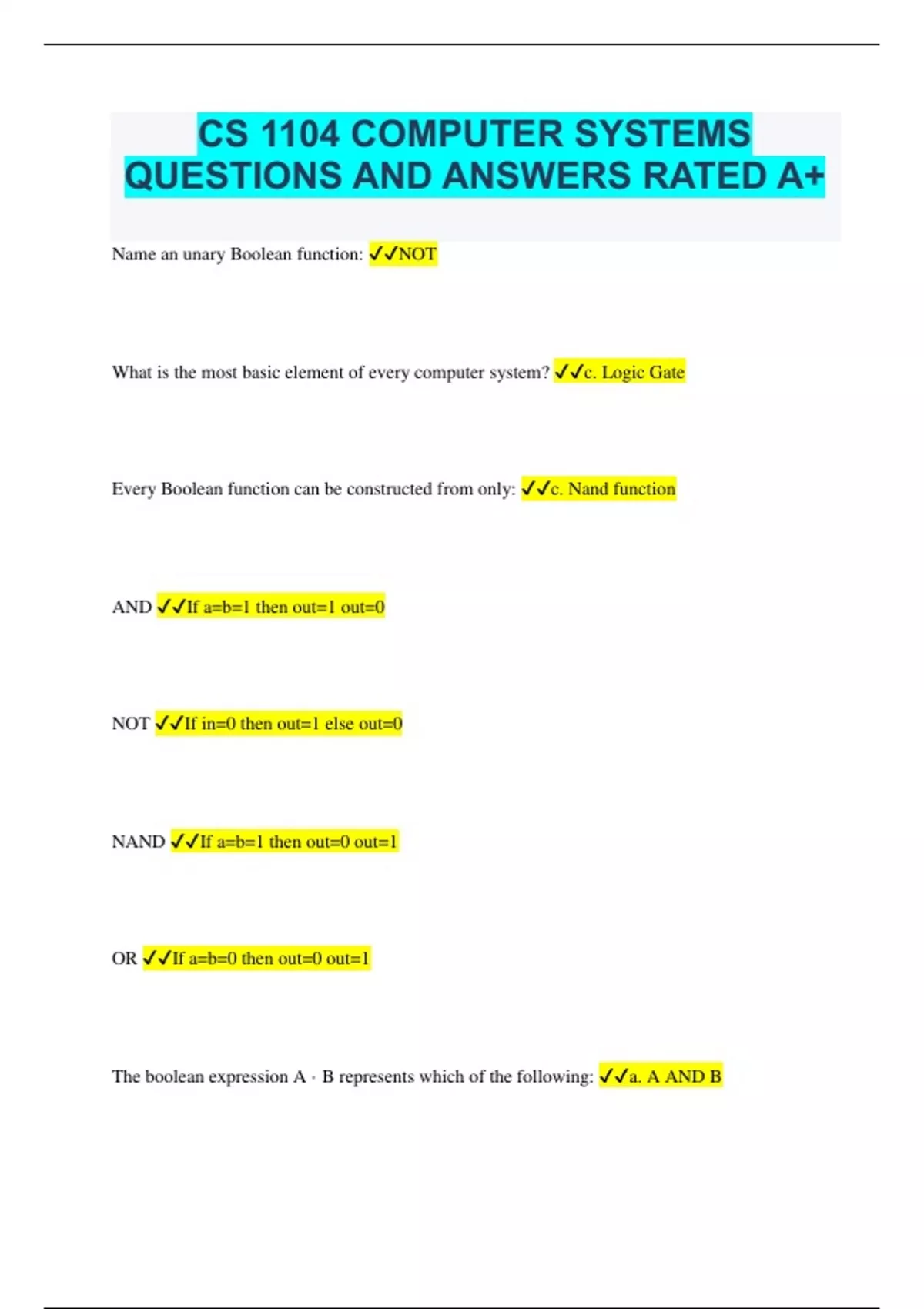 CS 1104 COMPUTER SYSTEMS QUESTIONS AND ANSWERS RATED A+