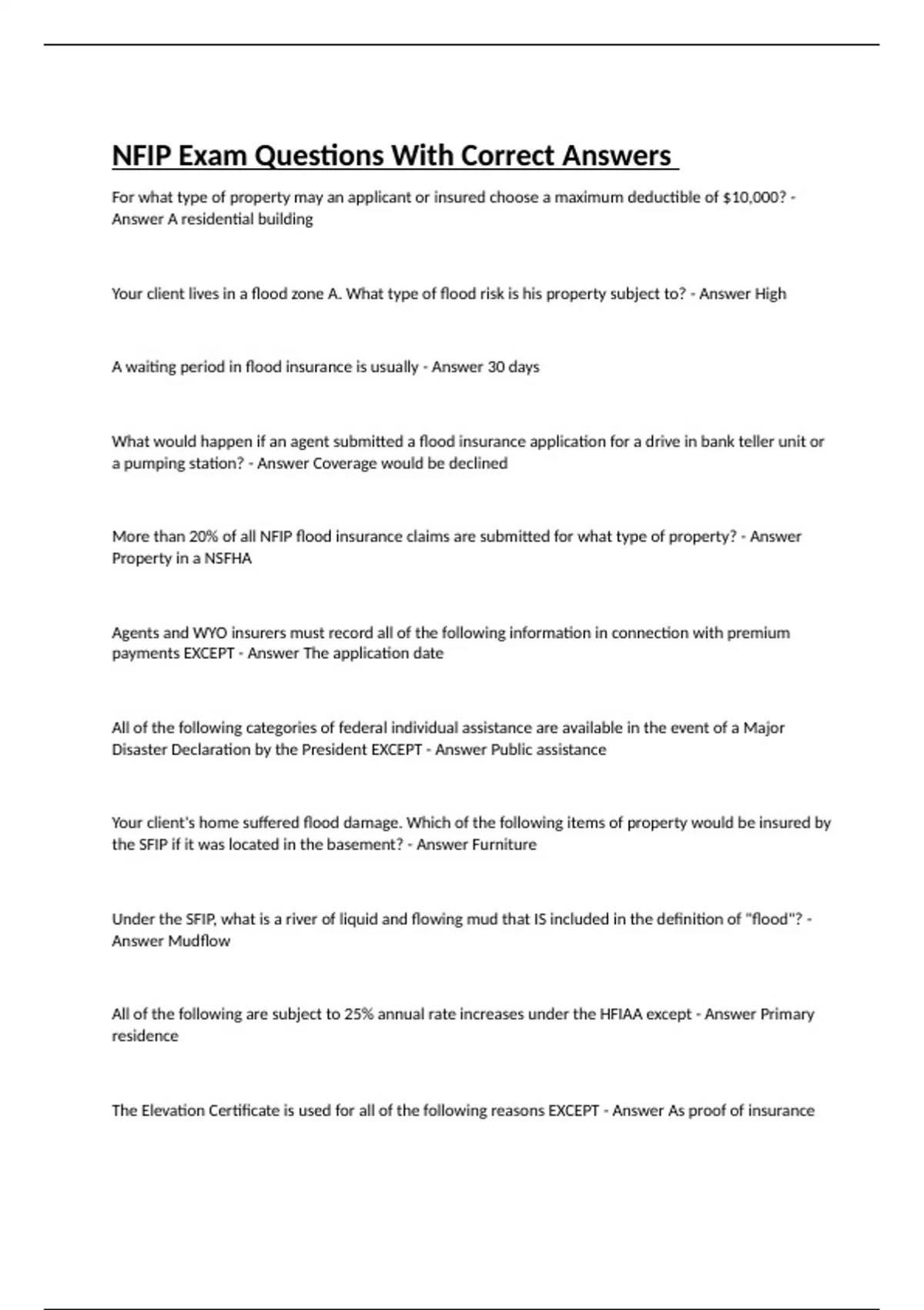For what type of property may an applicant or insured choose a maximum deductible of $10,000? - Answer A residential building Your client lives in a flood zone A. What type of flood risk is his property subject to? - Answer High A waiting period in flood insurance is usually - Answer 30 days What would happen if an agent submitted a flood insurance application for a drive in bank teller unit or a pumping station? - Answer Coverage would be declined More than 20% of all NFIP flood insurance claims are submitted for what type of property? - Answer Property in a NSFHA Agents and WYO insurers must record all of the following information in connection with premium payments EXCEPT - Answer The application date All of the following categories of federal individual assistance are available in the event of a Major Disaster Declaration by the President EXCEPT - Answer Public assistance Your client's home suffered flood damage. Which of the following items of property would be insured by the SFIP if it was located in the basement? - Answer Furniture Under the SFIP, what is a river of liquid and flowing mud that IS included in the definition of "flood"? - Answer Mudflow All of the following are subject to 25% annual rate increases under the HFIAA except - Answer Primary residence The Elevation Certificate is used for all of the following reasons EXCEPT - Answer As proof of insurance Under the SFIP, all of the following are considered Property Not Covered EXCEPT - Answer Bathroom fixtures Which of the following statements is a TRUE statement about an Elevation Certificate (EC)? - Answer A new property owner may use the previous owner's EC Special loss settlement applies to which of the following types of buildings? - Answer Manufactured home Under Coverage A of the SFIP, what type of appurtenant structure may ONLY be insured by the Dwelling Form? - Answer Detached garage Which of the following statements BEST describes the NFIP's use of binders? - Answer It does not recognize binders
