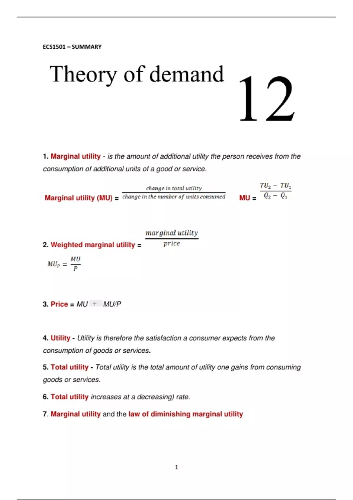 1. Marginal utility - is the amount of additional utility the person receives from the