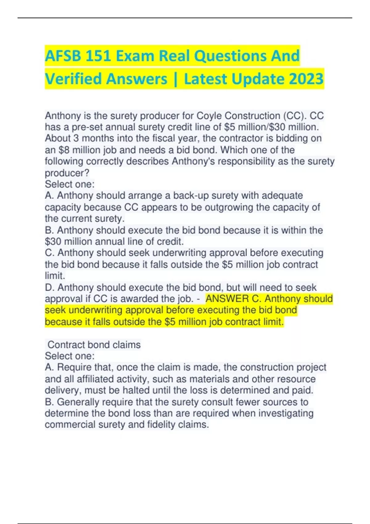 AFSB 151 Exam Real Questions And Verified Answers | Latest Update 2023 Anthony is the surety producer for Coyle Construction (CC). CC has a pre-set annual surety credit line of $5 million/$30 million. About 3 months into the fiscal year, the contractor is bidding on an $8 million job and needs a bid bond. Which one of the following correctly describes Anthony's responsibility as the surety producer? Select one: A. Anthony should arrange a back-up surety with adequate capacity because CC appears to be outgrowing the capacity of the current surety. B. Anthony should execute the bid bond because it is within the $30 million annual line of credit. C. Anthony should seek underwriting approval before executing the bid bond because it falls outside the $5 million job contract limit. D. Anthony should execute the bid bond, but will need to seek approval if CC is awarded the job. - ANSWER C. Anthony should seek underwriting approval before executing the bid bond because it falls outside the $5 million job contract limit. Contract bond claims Select one: A. Require that, once the claim is made, the construction project and all affiliated activity, such as materials and other resource delivery, must be halted until the loss is determined and paid. B. Generally require that the surety consult fewer sources to determine the bond loss than are required when investigating commercial surety and fidelity claims. C. That are not handled promptly are not affected by variables such as the construction project, materials, and weather conditions. D. Can raise questions as to fault in the loss, whether the bonded principal or the obligee was responsible. - ANSWER D. Can raise questions as to fault in the loss, whether the bonded principal or the obligee was responsible. Which one of the following statements regarding fidelity bond claims is true? Select one: A. There are no time limits for bringing claims under a fidelity bond, so an insurer does not need to be concerned about whether the loss was discovered during the policy term. B. The insured's prompt notice of loss and the fidelity's prompt investigation has no impact on the insurer's liability, the cause of loss, or the insured's minimization of damages. C. Mishandling of funds by people or entities not employed by the insured, such as auditors, lawyers, or financial institutions, cannot be pursued by the insurer as a source of recovery. D. By promptly investigating a bond loss, an insurer may discover that it has recourse against persons or entities whose conduct caused or contributed to the loss, but is not relevant to the proof of loss. - ANSWER D. By promptly investigating a bond loss, an insurer may discover that it has recourse against persons or entities whose conduct caused or contributed to the loss, but is not relevant to the proof of loss. Which one of the following statements regarding legal research and unfair claims practices acts is true? Select one: A. Even when fidelity and surety businesses are not affected by unfair claims practices laws that originate from individual consumers' concerns, state lawmakers require that they adhere to these laws. B. Unfair claims practices acts can prevent sureties from adequately investigating fidelity and surety claims so that standards for prompt settlement or denial can be met. C. Because sureties can retain attorneys experienced in the fidelity and surety legal matters, claims personnel do not require knowledge of legal rules and theories that govern such coverage and liability. D. Unfair claims practices acts prohibit sureties and insurers from misrepresenting pertinent facts or policy provisions relating to coverages at issue. - ANSWER D. Unfair claims practices acts prohibit sureties and insurers from misrepresenting pertinent facts or policy provisions relating to coverages at issue.