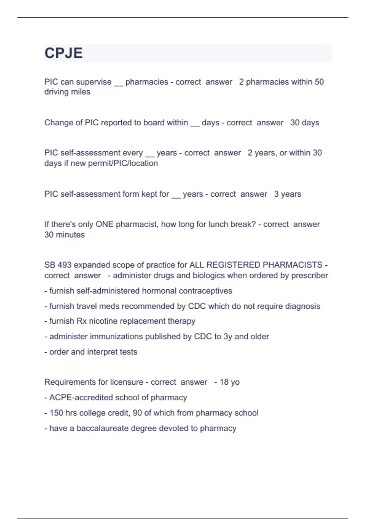 CPJE Question and answers correctly solved 2023/2024PIC can supervise __ pharmacies - correct answer 2 pharmacies within 50 driving miles Change of PIC reported to board within __ days - correct answer 30 days PIC self-assessment every __ years - correct answer 2 years, or within 30 days if new permit/PIC/location PIC self-assessment form kept for __ years - correct answer 3 years