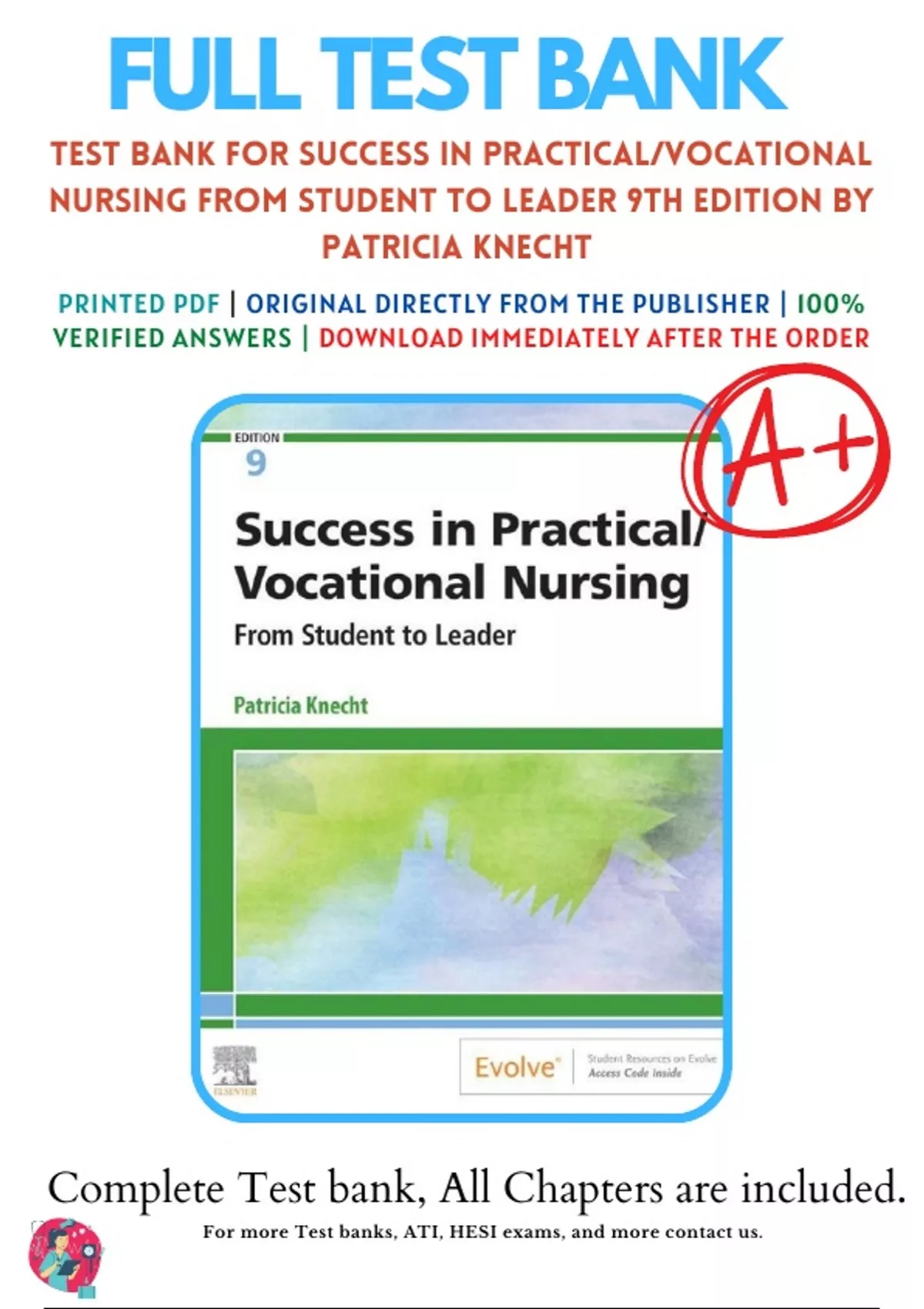 Test Bank For Success in Practical Vocational Nursing, 9th Edition by Knecht | 9780323683722 | All Chapters with Answers and Rationals