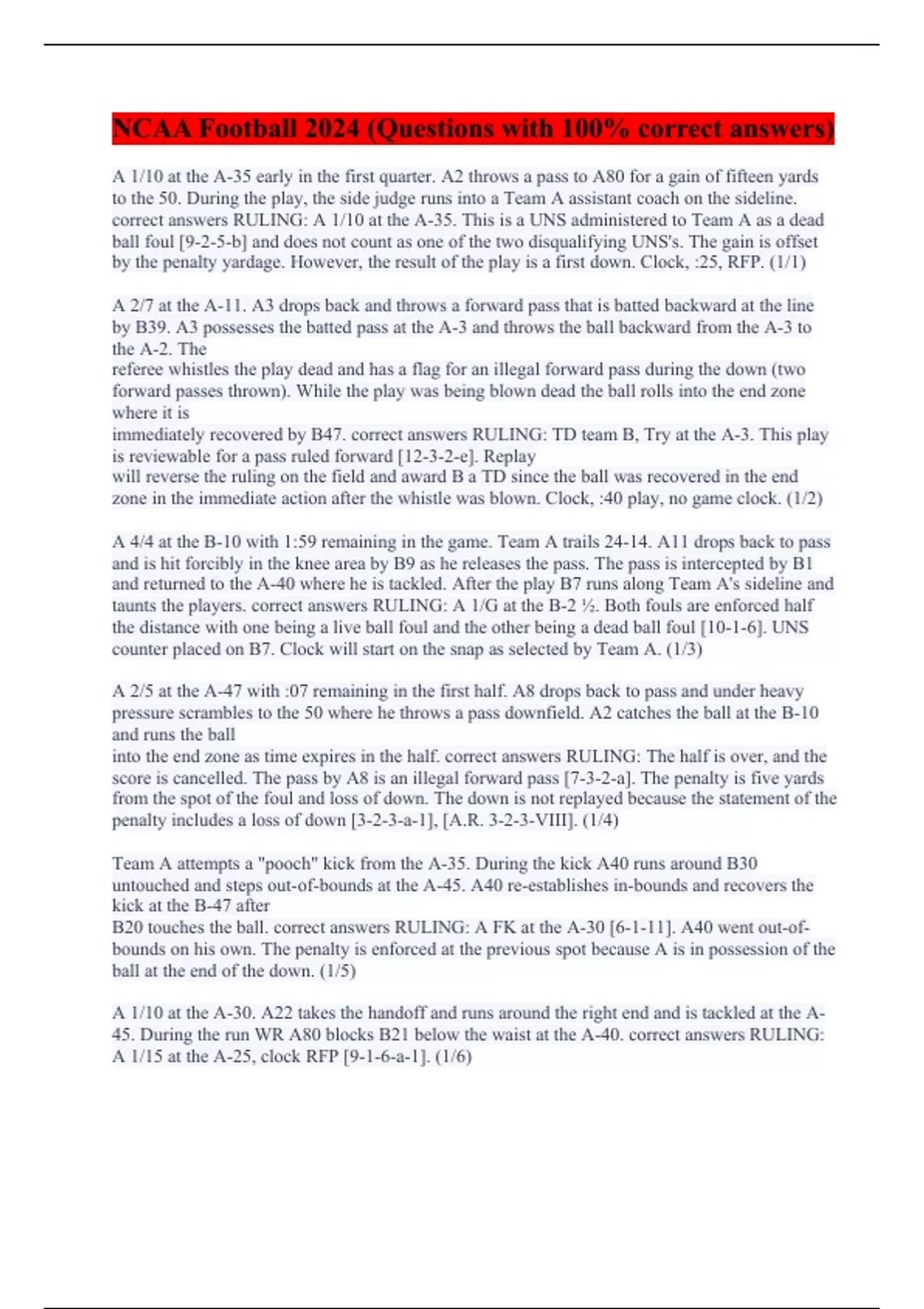 A 1/10 at the A-35 early in the first quarter. A2 throws a pass to A80 for a gain of fifteen yards to the 50. During the play, the side judge runs into a Team A assistant coach on the sideline. correct answers RULING: A 1/10 at the A-35. This is a UNS administered to Team A as a dead ball foul [9-2-5-b] and does not count as one of the two disqualifying UNS's. The gain is offset by the penalty yardage. However, the result of the play is a first down. Clock, :25, RFP. (1/1) A 2/7 at the A-11. A3 drops back and throws a forward pass that is batted backward at the line by B39. A3 possesses the batted pass at the A-3 and throws the ball backward from the A-3 to the A-2. The referee whistles the play dead and has a flag for an illegal forward pass during the down (two forward passes thrown). While the play was being blown dead the ball rolls into the end zone where it is immediately recovered by B47. correct answers RULING: TD team B, Try at the A-3. This play is reviewable for a pass ruled forward [12-3-2-e]. Replay will reverse the ruling on the field and award B a TD since the ball was recovered in the end zone in the immediate action after the whistle was blown. Clock, :40 play, no game clock. (1/2) A 4/4 at the B-10 with 1:59 remaining in the game. Team A trails 24-14. A11 drops back to pass and is hit forcibly in the knee area by B9 as he releases the pass. The pass is intercepted by B1 and returned to the A-40 where he is tackled. After the play B7 runs along Team A's sideline and taunts the players. correct answers RULING: A 1/G at the B-2 ½. Both fouls are enforced half the distance with one being a live ball foul and the other being a dead ball foul [10-1-6]. UNS counter placed on B7. Clock will start on the snap as selected by Team A. (1/3) A 2/5 at the A-47 with :07 remaining in the first half. A8 drops back to pass and under heavy pressure scrambles to the 50 where he throws a pass downfield. A2 catches the ball at the B-10 and runs the ball into the end zone as time expires in the half. correct answers RULING: The half is over, and the score is cancelled. The pass by A8 is an illegal forward pass [7-3-2-a]. The penalty is five yards from the spot of the foul and loss of down. The down is not replayed because the statement of the penalty includes a loss of down [3-2-3-a-1], [A.R. 3-2-3-VIII]. (1/4) Team A attempts a "pooch" kick from the A-35. During the kick A40 runs around B30 untouched and steps out-of-bounds at the A-45. A40 re-establishes in-bounds and recovers the kick at the B-47 after B20 touches the ball. correct answers RULING: A FK at the A-30 [6-1-11]. A40 went out-of-bounds on his own. The penalty is enforced at the previous spot because A is in possession of the ball at the end of the down. (1/5) A 1/10 at the A-30. A22 takes the handoff and runs around the right end and is tackled at the A-45. During the run WR A80 blocks B21 below the waist at the A-40. correct answers RULING: A 1/15 at the A-25, clock RFP [9-1-6-a-1]. (1/6)