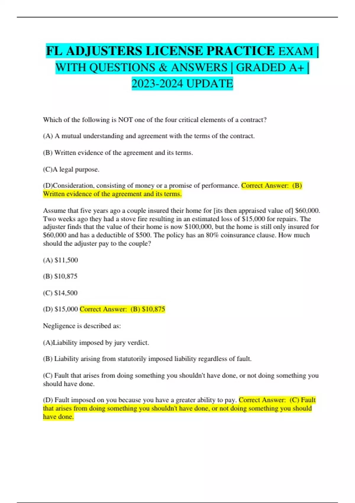 FL ADJUSTERS LICENSE PRACTICE EXAM | WITH QUESTIONS & ANSWERS | GRADED A+ | UPDATE Which of the following is NOT one of the four critical elements of a contract? (A) A mutual understanding and agreement with the terms of the contract. (B) Written evidence of the agreement and its terms. (C)A legal purpose. (D)Consideration, consisting of money or a promise of performance. Correct Answer: (B) Written evidence of the agreement and its terms. Assume that five years ago a couple insured their home for [its then appraised value of] $60,000. Two weeks ago they had a stove fire resulting in an estimated loss of $15,000 for repairs. The adjuster finds that the value of their home is now $100,000, but the home is still only insured for $60,000 and has a deductible of $500. The policy has an 80% coinsurance clause. How much should the adjuster pay to the couple? (A) $11,500 (B) $10,875 (C) $14,500 (D) $15,000 Correct Answer: (B) $10,875 Negligence is described as: (A)Liability imposed by jury verdict. (B) Liability arising from statutorily imposed liability regardless of fault. (C) Fault that arises from doing something you shouldn't have done, or not doing something you should have done. (D) Fault imposed on you because you have a greater ability to pay. Correct Answer: (C) Fault that arises from doing something you shouldn't have done, or not doing something you should have done
