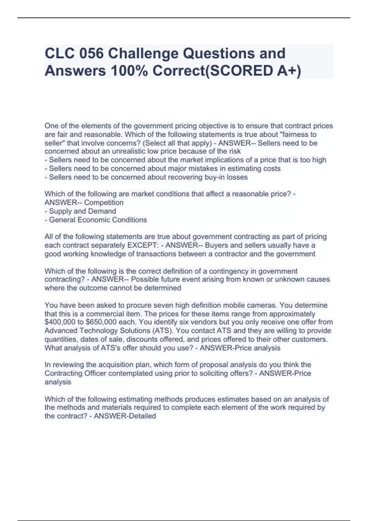 One of the elements of the government pricing objective is to ensure that contract prices are fair and reasonable. Which of the following statements is true about "fairness to seller" that involve concerns? (Select all that apply) - ANSWER-- Sellers need to be concerned about an unrealistic low price because of the risk - Sellers need to be concerned about the market implications of a price that is too high - Sellers need to be concerned about major mistakes in estimating costs - Sellers need to be concerned about recovering buy-in losses Which of the following are market conditions that affect a reasonable price? - ANSWER-- Competition - Supply and Demand - General Economic Conditions All of the following statements are true about government contracting as part of pricing each contract separately EXCEPT: - ANSWER-- Buyers and sellers usually have a good working knowledge of transactions between a contractor and the government Which of the following is the correct definition of a contingency in government contracting? - ANSWER-- Possible future event arising from known or unknown causes where the outcome cannot be determined You have been asked to procure seven high definition mobile cameras. You determine that this is a commercial item. The prices for these items range from approximately $400,000 to $650,000 each. You identify six vendors but you only receive one offer from Advanced Technology Solutions (ATS). You contact ATS and they are willing to provide quantities, dates of sale, discounts offered, and prices offered to their other customers. What analysis of ATS's offer should you use? - ANSWER-Price analysis In reviewing the acquisition plan, which form of proposal analysis do you think the Contracting Officer contemplated using prior to soliciting offers? - ANSWER-Price analysis Which of the following estimating methods produces estimates based on an analysis of the methods and materials req