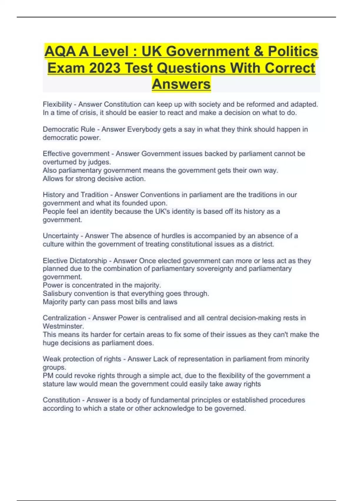 AQA A Level : UK Government & Politics Exam 2023 Test Questions With Correct Answers