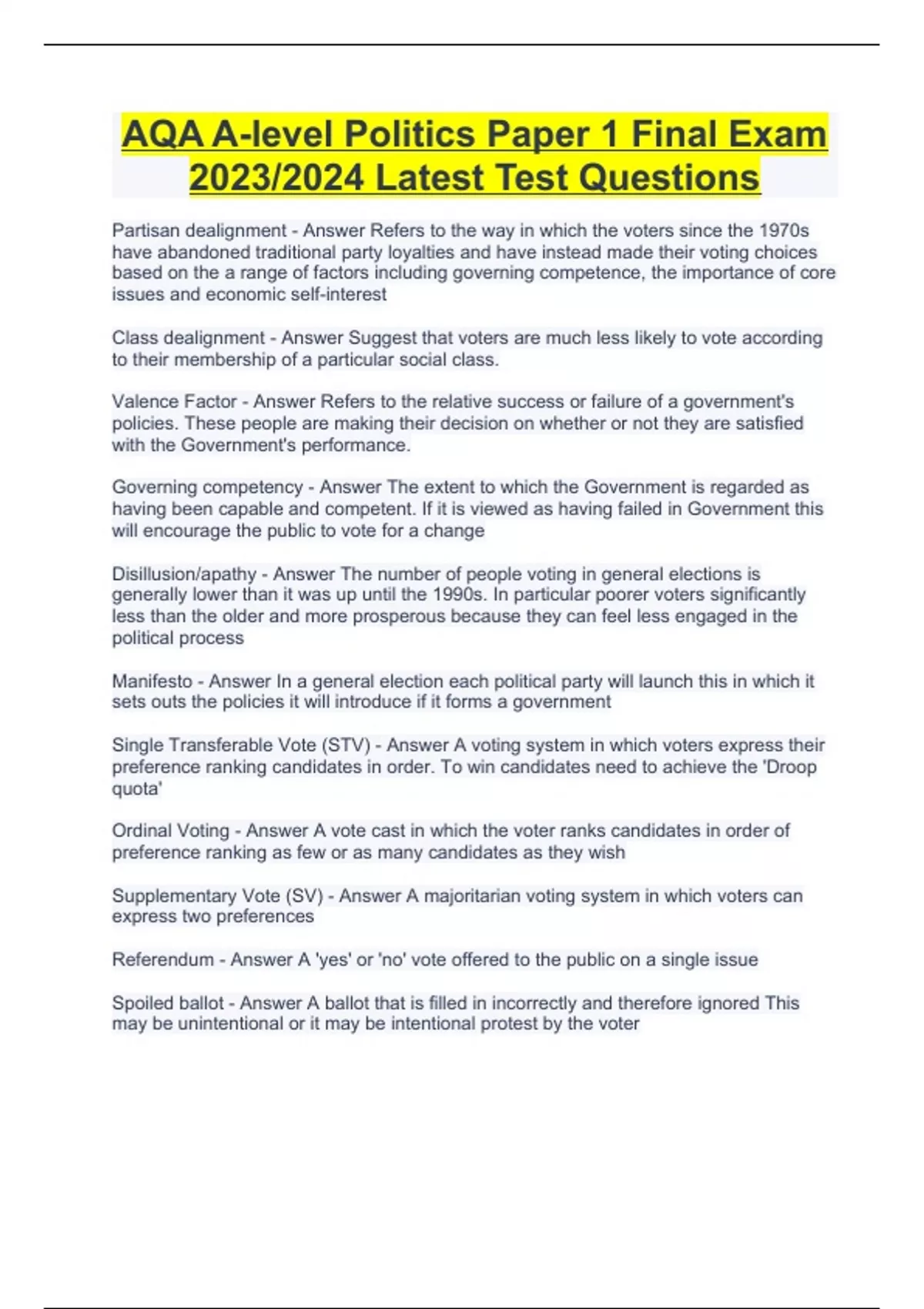 AQA A-level Politics Paper 1 Final Exam 2023/2024 Latest Test Questions