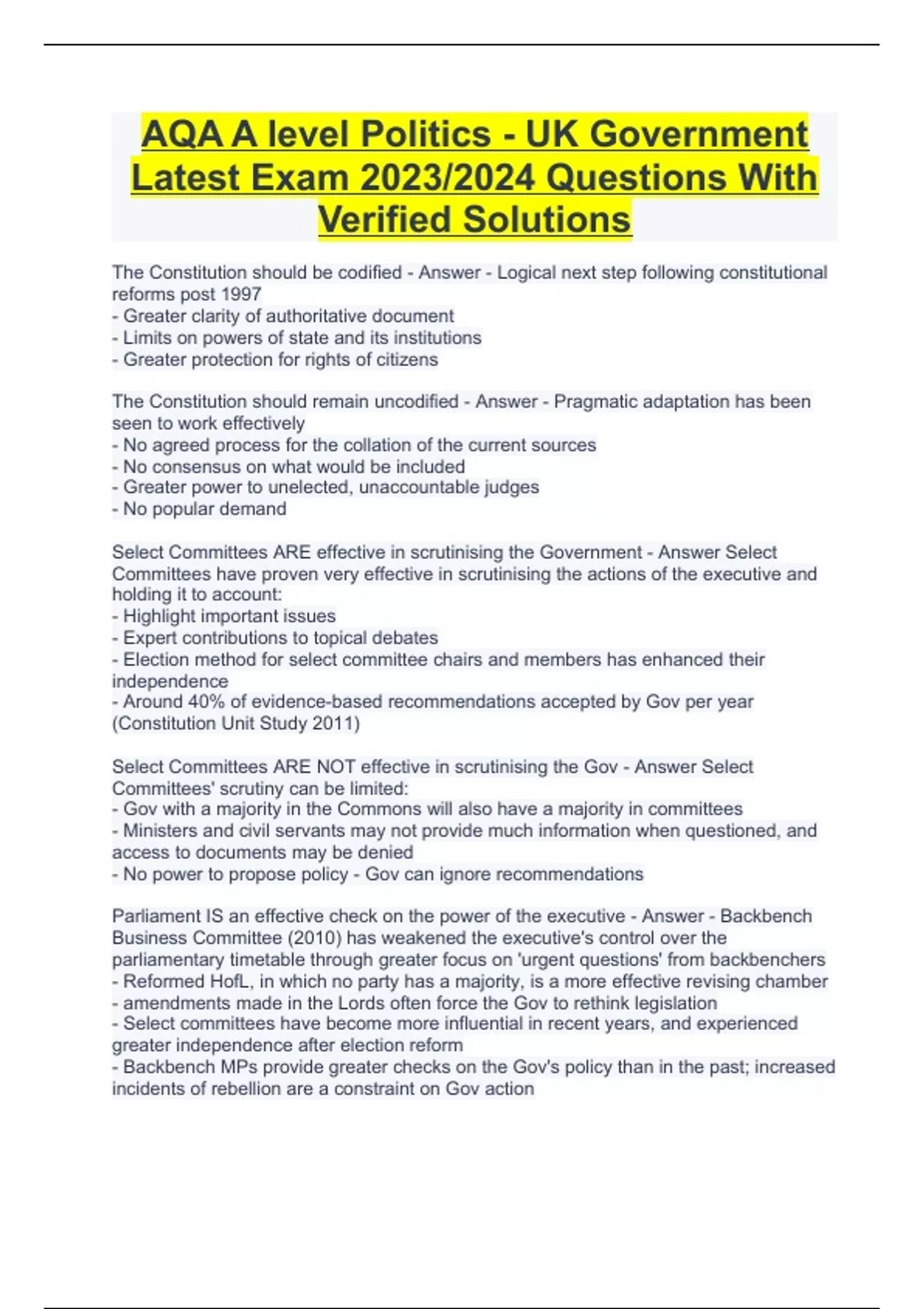 AQA A level Politics - UK Government Latest Exam 2023/2024 Questions With Verified Solutions
