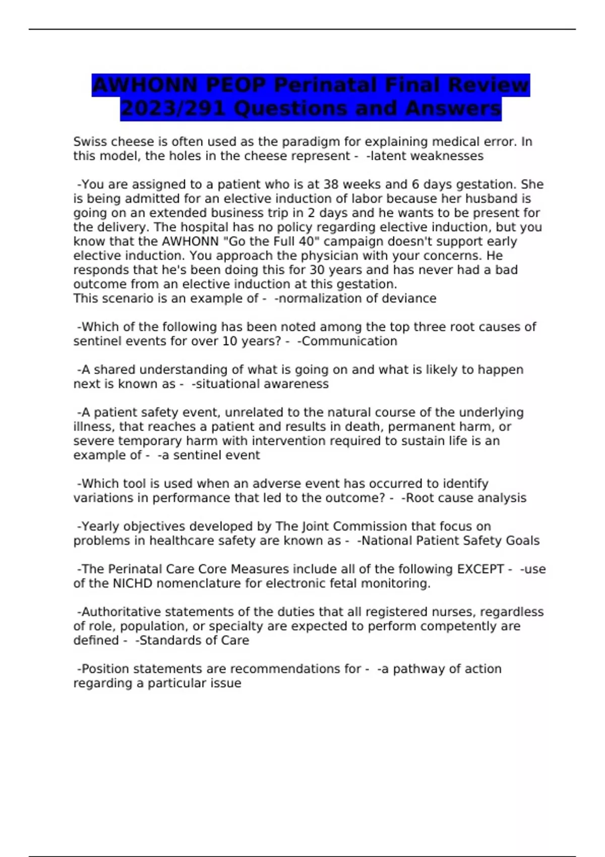 AWHONN PEOP Perinatal Final Review 2023/291 Questions and Answers
