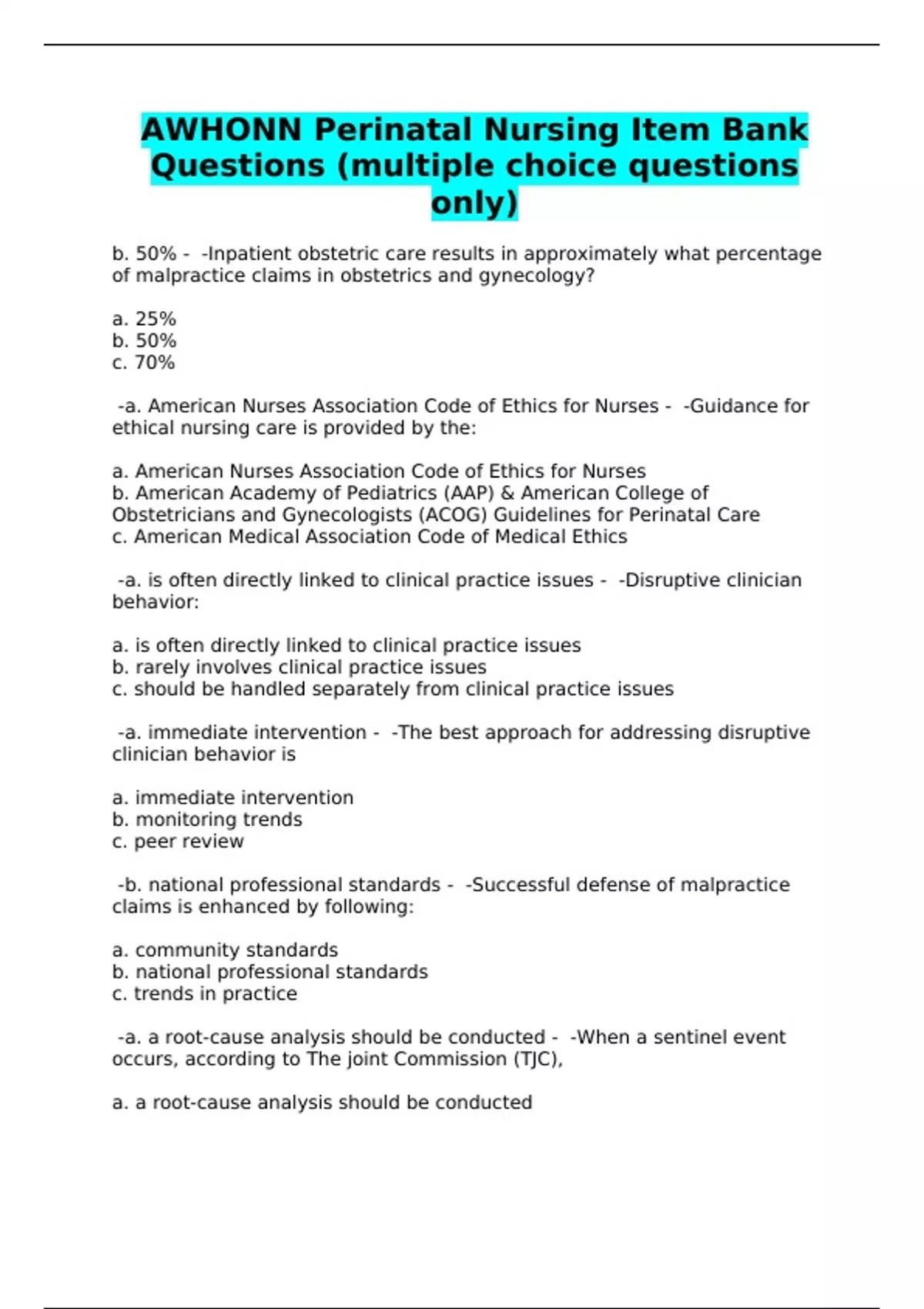 AWHONN Perinatal Nursing Item Bank Questions (multiple choice questions only)