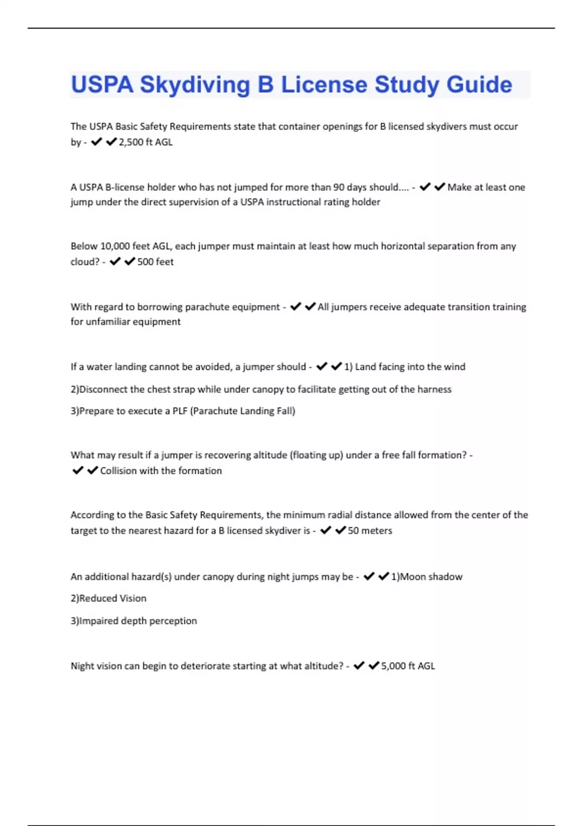 USPA Skydiving B License Study Guide Questions With 100% Correct Answers.
