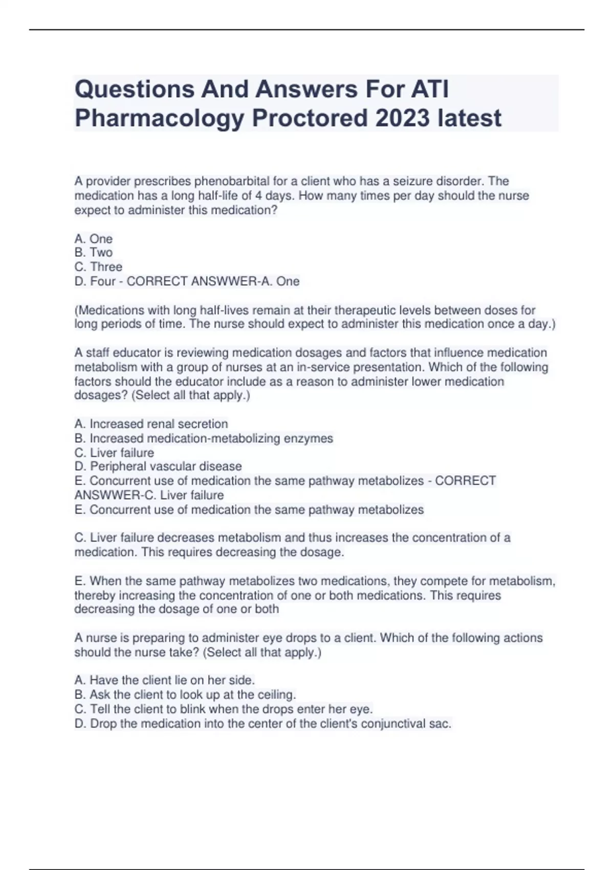 A provider prescribes phenobarbital for a client who has a seizure disorder. The medication has a long half-life of 4 days. How many times per day should the nurse expect to administer this medication? A. One B. Two C. Three D. Four - CORRECT ANSWWER-A. One (Medications with long half-lives remain at their therapeutic levels between doses for long periods of time. The nurse should expect to administer this medication once a day.) A staff educator is reviewing medication dosages and factors that influence medication metabolism with a group of nurses at an in-service presentation. Which of the following factors should the educator include as a reason to administer lower medication dosages? (Select all that apply.) A. Increased renal secretion B. Increased medication-metabolizing enzymes C. Liver failure D. Peripheral vascular disease E. Concurrent use of medication the same pathway metabolizes - CORRECT ANSWWER-C. Liver failure E. Concurrent use of medication the same pathway metabolizes C. Liver failure decreases metabolism and thus increases the concentration of a medication. This requires decreasing the dosage. E. When the same pathway metabolizes two medications, they compete for metabolism, thereby increasing the concentration of one or both medication