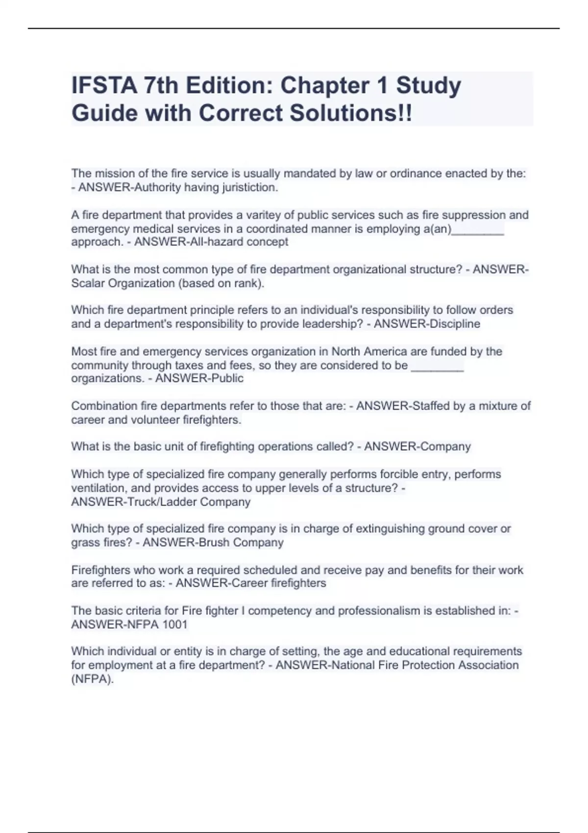 IFSTA 7th Edition: Chapter 1 S The mission of the fire service is usually mandated by law or ordinance enacted by the: - ANSWER-Authority having juristiction. A fire department that provides a varitey of public services such as fire suppression and emergency medical services in a coordinated manner is employing a(an)________ approach. - ANSWER-All-hazard concept What is the most common type of fire department organizational structure? - ANSWER-Scalar Organization (based on rank). Which fire department principle refers to an individual's responsibility to follow orders and a department's responsibility to provide leadership? - ANSWER-Discipline Most fire and emergency services organization in North America are funded by the community through taxes and fees, so they are considered to be ________ organizations. - ANSWER-Public Combination fire departments refer to those that are: - ANSWER-Staffed by a mixture of career and volunteer firefighters. What is the basic unit of firefighting operations called? - ANSWER-Company Which type of specialized fire company generally performs forcible entry, performs ventilationtudy Guide with Correct Solutions!!