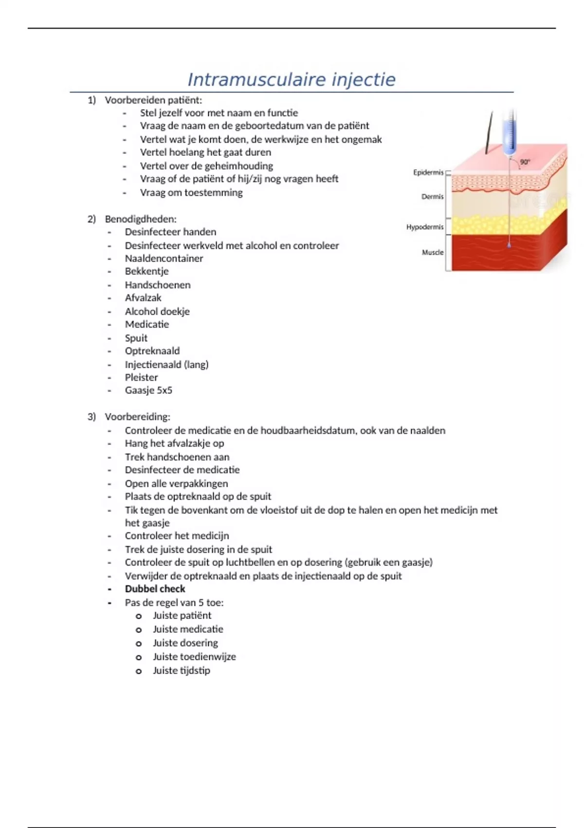 Dit document is goed te gebruiken bij het leren voor de performance assessment. Het bevat een beknopte uitleg over het toedienen van een intramusculaire injectie.