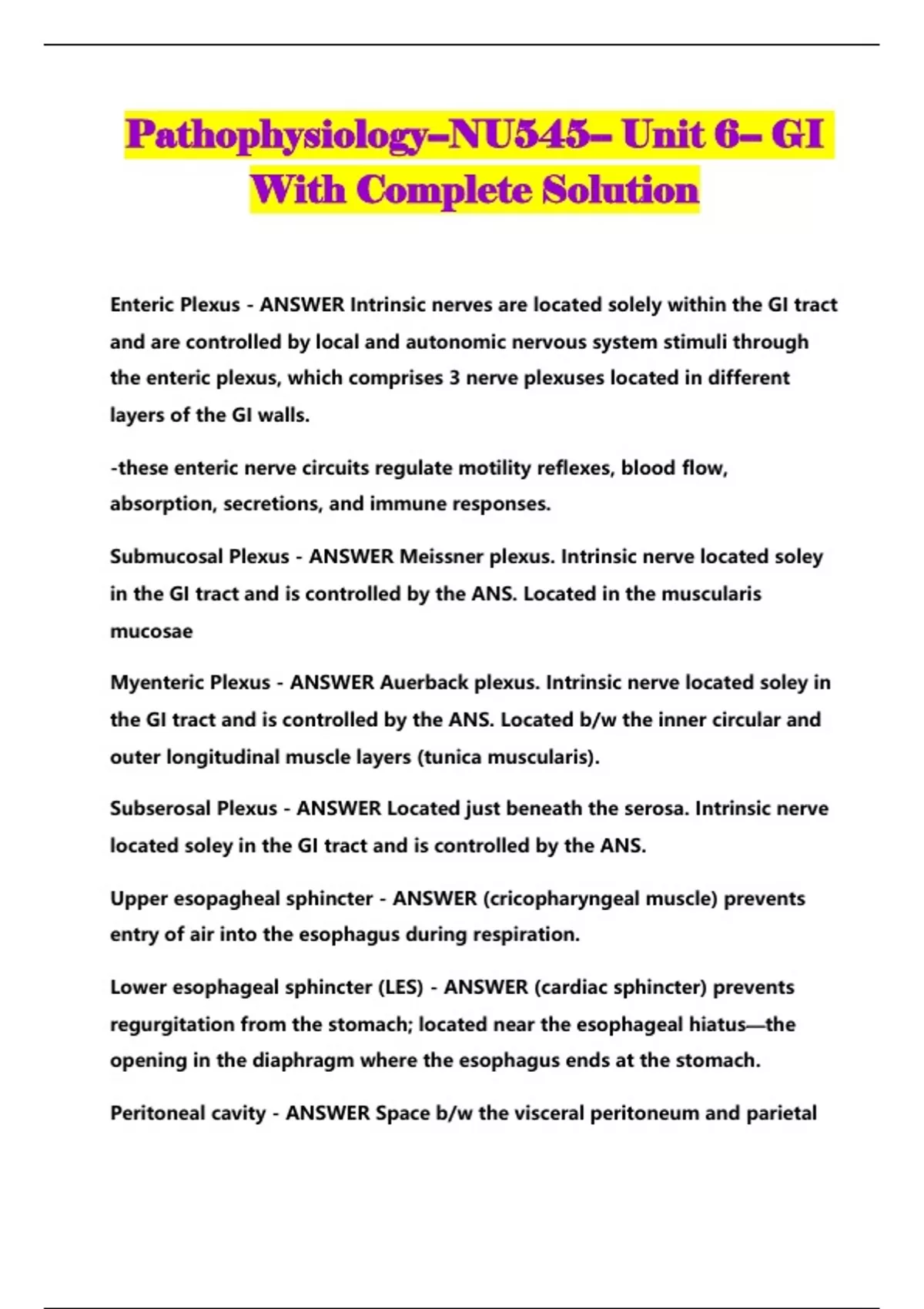 Pathophysiology--NU545-- Unit 6-- GI With Complete Solution