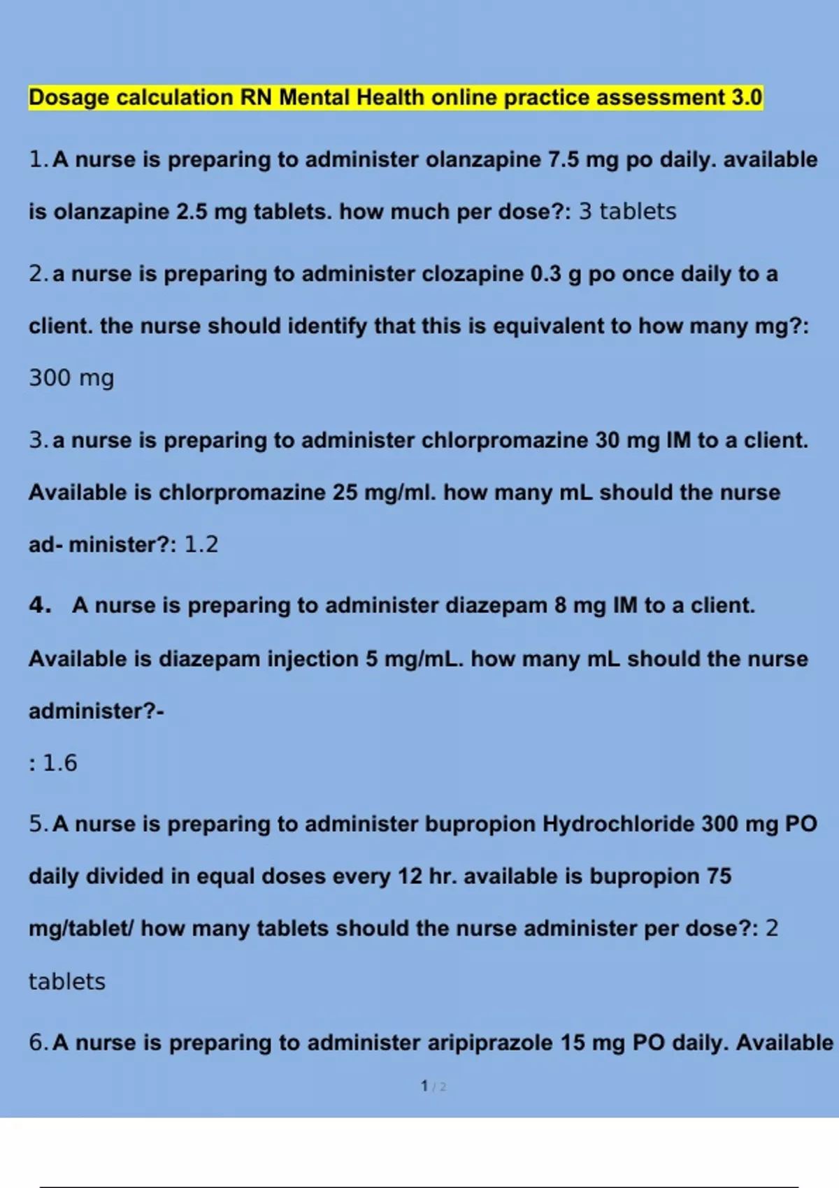 Dosage calculation RN Mental Health online practice assessment 3.0 Questions and Answers (2024/2025) (Verified Answers) pdf Dosage calculation RN Mental Health online practice assessment 3.0 Questions and Answers (2024/2025) (Verified Answers) pdf