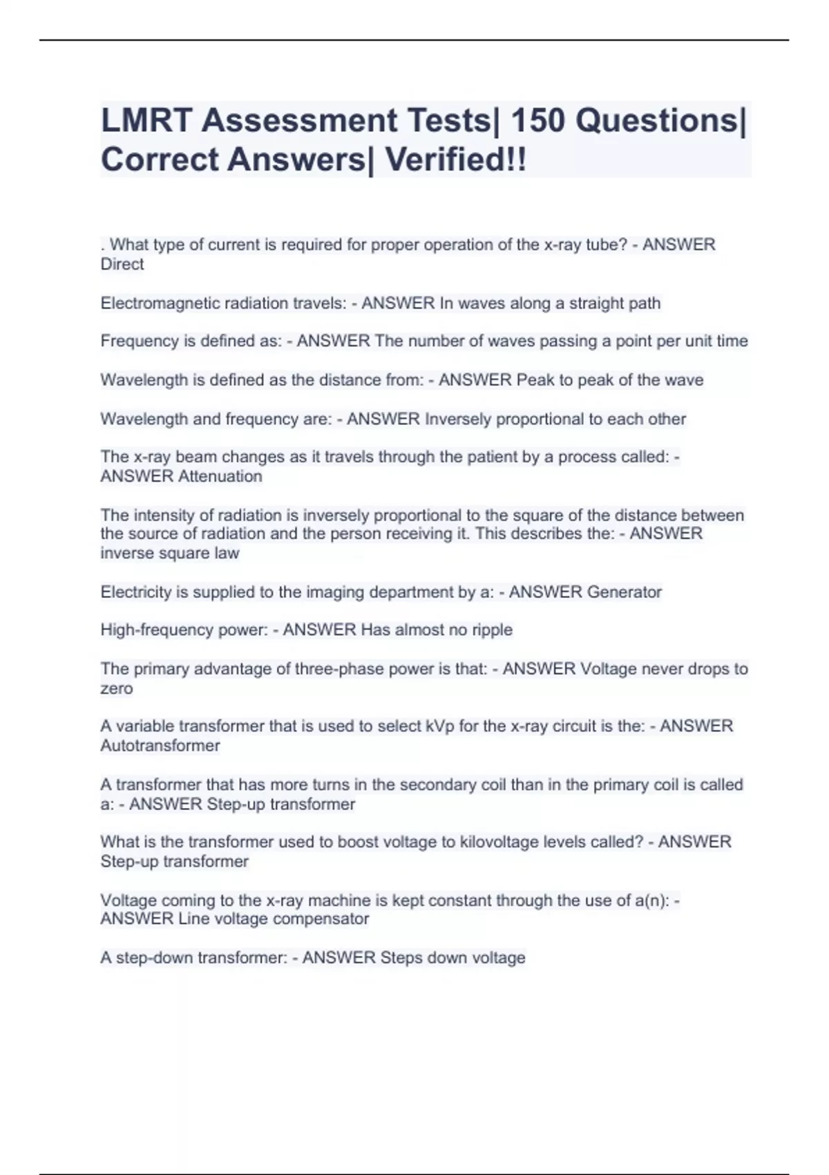 LMRT Assessment Tests| 150 Questions| Cor . What type of current is required for proper operation of the x-ray tube? - ANSWER Direct Electromagnetic radiation travels: - ANSWER In waves along a straight path Frequency is defined as: - ANSWER The number of waves passing a point per unit time Wavelength is defined as the distance from: - ANSWER Peak to peak of the wave Wavelength and frequency are: - ANSWER Inversely proportional to each other The x-ray beam changes as it travels through the patient by a process called: - ANSWER Attenuation The intensity of radiation is inversely proportional to the square of the distance between the source of radiation and the person receiving it. This describes the: - ANSWER inverse square law Electricity is supplied to the imaging department by a: - ANSWER Generator High-frequency power: - ANSWER Has almost no ripple The primary advantage of three-phase power is that: - ANSWER Voltage never drops to zero rect Answers| Verified!!