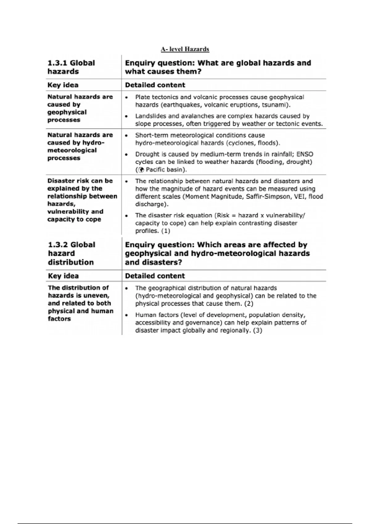 Summary Hazards- International A-Level Geography notes including AS-Level