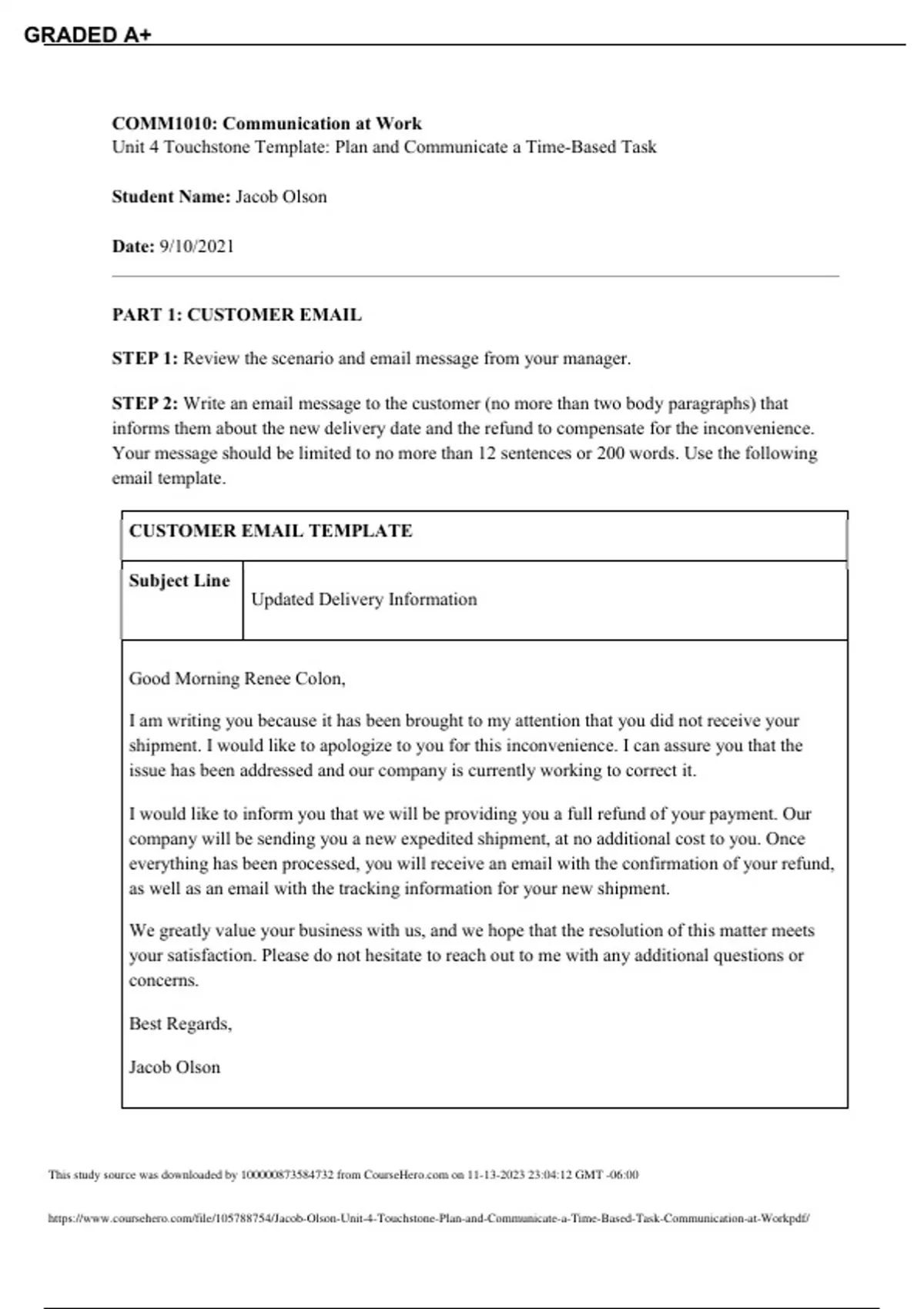 COMM1010: Communication at Work Unit 4 Touchstone Template: Plan and Communicate a Time-Based Task Student Name: Jacob Olson Date: 9/10/2021 PART 1: CUSTOMER EMAIL STEP 1: Review the scenario and email message from your manager. STEP 2: Write an email message to the customer (no more than two body paragraphs) that informs them about the new delivery date and the refund to compensate for the inconvenience. Your message should be limited to no more than 12 sentences or 200 words. Use the following email template. CUSTOMER EMAIL TEMPLATE Subject Line Updated Delivery Information Good Morning Renee Colon, I am writing you because it has been brought to my attention that you did not receive your shipment. I would like to apologize to you for this inconvenience. I can assure you that the issue has been addressed and our company is currently working to correct it. I would like to inform you that we will be providing you a full refund of your payment. Our company will be sending you a new expedited shipment, at no additional cost to you. Once everything has been processed, you will receive an email with the confirmation of your refund, as well as an email with the tracking information for your new shipment. We greatly value your business with us, and we hope that the resolution of this matter meets your satisfaction. Please do not hesitate to reach out to me with any additional questions or concerns. Best Regards, Jacob Olson This study source was downloaded by from CourseH on :04:12 GMT -06:00 GRADED A+ STEP 3: Review your message to ensure that: ● It includes information relevant for the customer, including the purpose of the email and how the errors will be addressed. ● It emphasizes important points using style mechanics common in professional writing. ● It uses professional language and tone appropriate for a response to an important customer. PART 2: COMMUNICATE A TIME-BASED TASK STEP 1: Review the scenario and email message from your manager. Also review the to-do items that need to be completed and their deadlines in the chart below. Goal Task Due Date Status Inform customer Email Renee Colon Monday To do Inform relevant departments Contact Accounts Receivable (AR) Monday (end of day) To do Contact Shipping Monday (end of day) To do Refund customer AR issues refund to customer Tuesday To do AR does not charge for replacement Tuesday To do AR send confirmation to customer Tuesday To do Ship replacement package Package is expedited Wednesday To do Tracking info sent to customer Wednesday To do STEP 2: Based on this information, you will need to communicate an internal plan regarding the refund and redelivery of the shipment by drafting a message to your colleagues in the Accounts Receivable and Shipping Departments. Your message should clearly identify who has what task and the time frame for completion. Select an appropriate tool from the following list to communicate this message to your colleagues. Explain why this would be an effective tool for this purpose. This study source was downloaded by from CourseH on :04:12 GMT -06:00 GRADED A+ Tool Options (Select one): ● Chat message (e.g., Slack, Microsoft Teams) ● Email (e.g., Microsoft Outlook) ● Video Message (e.g., Webex, Zoom) ● Text message (e.g., Android of iOS text messaging) ● Voicemail (e.g., Conference phone, cell phones / smartphones, Google Voice) Tool Selected Email Why is this an effective tool for the purpose of the message? An email gives an immediate platform, which can be labelled as urgent, as well as receipt requested to ensure delivery. STEP 3: Use the following template to construct your message. Format it appropriately for the tool you have selected. If you selected a video message or voicemail tool, provide a written transcript of your message below. Your message should be limited to no more than 12 sentences or 200 words. TEAM MESSAGE TEMPLATE Good afternoon Accounts Receivable and Shipping, Please be advised that the shipment for Renee Colon was not received. It is critical that this issue is resolved immediately, because keeping this customer is crucial. Below are instructions as to how this matter will be resolved. Accounts Receivable: No later than Tuesday, September 14, 2021, provide a complete refund and replacement shipment at no additional cost. The customer is to be sent an email with the refund confirmation. Shipping: No later than Wednesday, September 15, 2021, a replacement shipment is to be expedited to the customer. The customer is to be sent an email with the tracking information. Thank you for your time and assistance in this matter, Jacob Olson This study source was downloaded by from CourseH on :04:12 GMT -06:00 GRADED A+ STEP 4: Review your message and make edits to ensure that: ● It clearly identifies who has what to-do item and by what time it needs to be completed. ● It emphasizes important points. ● It uses professional language and tone appropriate for internal communication with coworkers.