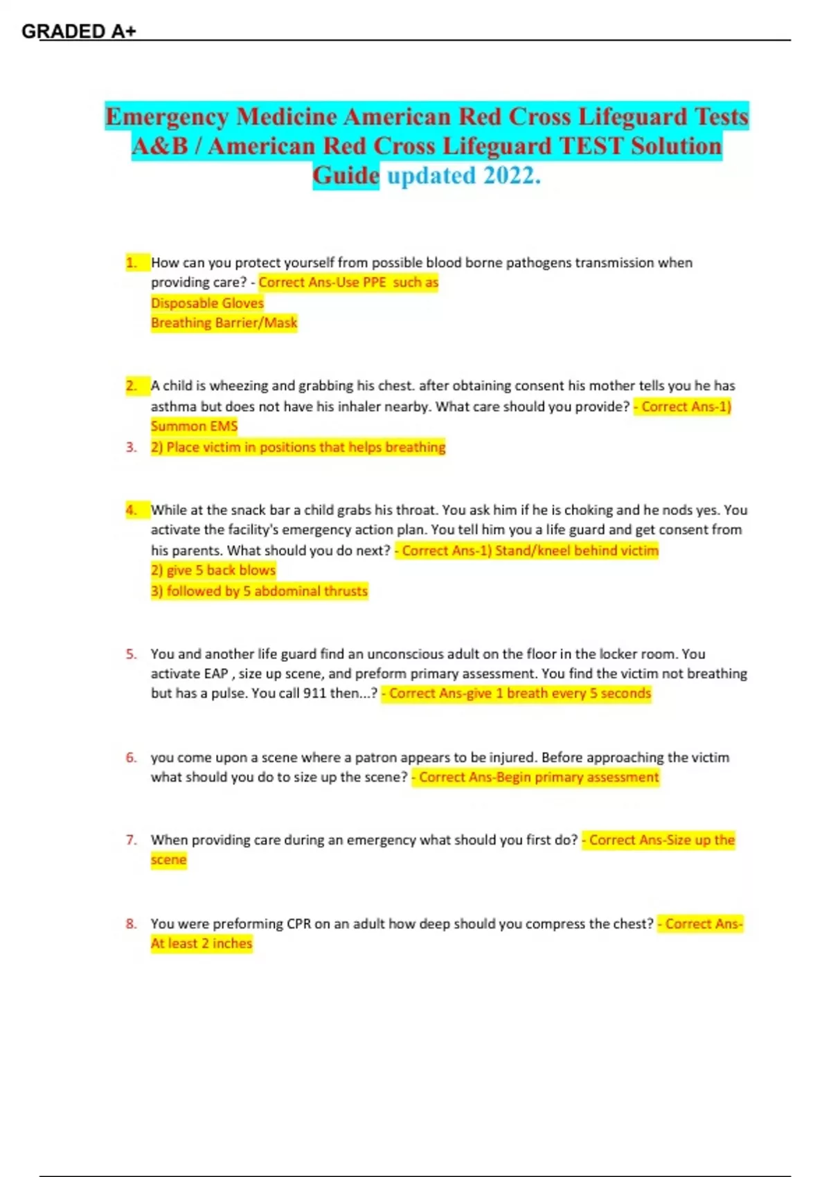 Emergency Medicine American Red Cross Lifeguard Tests A&B / American Red Cross Lifeguard TEST Solution Guide updated 2022. 1. How can you protect yourself from possible blood borne pathogens transmission when providing care? - Correct Ans-Use PPE such as Disposable Gloves Breathing Barrier/Mask 2. A child is wheezing and grabbing his chest. after obtaining consent his mother tells you he has asthma but does not have his inhaler nearby. What care should you provide? - Correct Ans-1) Summon EMS 3. 2) Place victim in positions that helps breathing 4. While at the snack bar a child grabs his throat. You ask him if he is choking and he nods yes. You activate the facility's emergency action plan. You tell him you a life guard and get consent from his parents. What should you do next? - Correct Ans-1) Stand/kneel behind victim 2) give 5 back blows 3) followed by 5 abdominal thrusts 5. You and another life guard find an unconscious adult on the floor in the locker room. You activate EAP , size up scene, and preform primary assessment. You find the victim not breathing but has a pulse. You call 911 then...? - Correct Ans-give 1 breath every 5 seconds 6. you come upon a scene where a patron appears to be injured. Before approaching the victim what should you do to size up the scene? - Correct Ans-Begin primary assessment 7. When providing care during an emergency what should you first do? - Correct Ans-Size up the scene 8. You were preforming CPR on an adult how deep should you compress the chest? - Correct AnsAt least 2 inches GRADED A+ 9. CPR should be preformed on victims whho are in...? - Correct Ans-Cardiac arrest 10. What is the fist step in the cardiac chain of survival? - Correct Ans-Early recognition +access to EMS 11. You are providing care to a victim having a heart attack. What should you do first? - Correct AnsSummon EMS 12. Once you turn in the AED you should...? - Correct Ans-apply pads and allow AED to analyze heart rhythms 13. To ensure effective chest compression during CPR you should...? - Correct Ans-Allow chest to fully recoil between chest compressions 14. You are preforming CPR on a victim and a 2nd life guard arrives. What should the second life guard do first? - Correct Ans-check whether EMS has been summoned 15. What should you use when giving ventilation to protect you and the victim from disease transmission? - Correct Ans-use a CPR breathing barrier/ mask 16. you are providing care to a pool maintenance worker who has fallen off a ladder. The victim is conscious. What should you do first? - Correct Ans-obtain consent from the victim 17. should you summon EMS personnel for a victim with an open wound with the bone protruding? - Correct Ans-yes 18. You pull an unconscious adult from the water who is taking infrequent gasps. During the primary assessment you find the victim has a pulse. What should you do next? - Correct Ans-give 2 initial ventilations 19. if there is a risk of the AED pads touching each other such as with a small child or infant what should you do? - Correct Ans-put one on the middle of the chest and one on the middle of the back GRADED A+ 20. you have sized up the scene and determined it is safe. Then performing a primary assessment what should you do next? - Correct Ans-check for responsiveness 21. when using a BVM it requires__________ rescuers. - Correct Ans-2 22. you are preparing to give ventilations to a 5 year old you give 1 ventilation about every ___________ seconds. - Correct Ans-3 23. when giving a child CPR you should do so at the rate of ______ compressions per minute. - Correct Ans-100 24. An AED has advised that a shock should be given what should you do next? - Correct Ans-tell everyone to stand clear 25. you are about to apply AED pads to a victims chest that has several body piercings on the chest what should you do? - Correct Ans-apply pads making sure to avoid the jewelry 26. the cycle of chest compressions and ventilations in 2 man CPR for an infant? - Correct Ans-15 compressions and 2 ventilations 27. you are positioned above the childs head and are using mask to give ventilations. After you position the mask what should you do? - Correct Ans-seal the mask 28. you are providing care to someone who has become unconscious while choking on some food what should you do first? - Correct Ans-lower person to ground and open airway 29. where should you place your hands when giving chest compressions to an infant - Correct Ans-1 hand on forehead 2-3 fingers on center of chest 30. when giving abdominal thrusts to an adult where do you position your fist? - Correct Ans-mid abdomen just above belly button GRADED A+ 31. when providing care to a conscious infant who is choking what do you do? - Correct Ans-position infant with head lower than chest 32. a person has been injured and is conscious. you should: - Correct Ans-1) obtain consent 2) check for life threatening conditions 3) find out what happened 33. the purpose of the secondary assessment is to: - Correct Ans-identify and care for conditions that are not life threatening 34. an injured patron is conscious and is bleeding severely. After calling EMS(911) obtaining consent and putting on disposable gloves what should you do? - Correct Ans-press firmly against the wound with a sterile dressing 35. a way to remember the questions to ask when taking a brief history is to use SAMPLE. What does each letter stand for? - Correct Ans-Signs and symptoms Allergies Medications Pertinent past medical history Last oral intake Event leading up to the incident 36. what is the first step you should taking caring for a burn victim - Correct Ans-remove victim from source of burn 37. what should you do if a victim has a seizure in the water? - Correct Ans-support victim with head above water until seizure ends 38. during a swim meet the bleachers collapse you check the scene and notice several people appear injured who do you approach first? - Correct Ans-unconscious victims 39. when caring for musculoskele