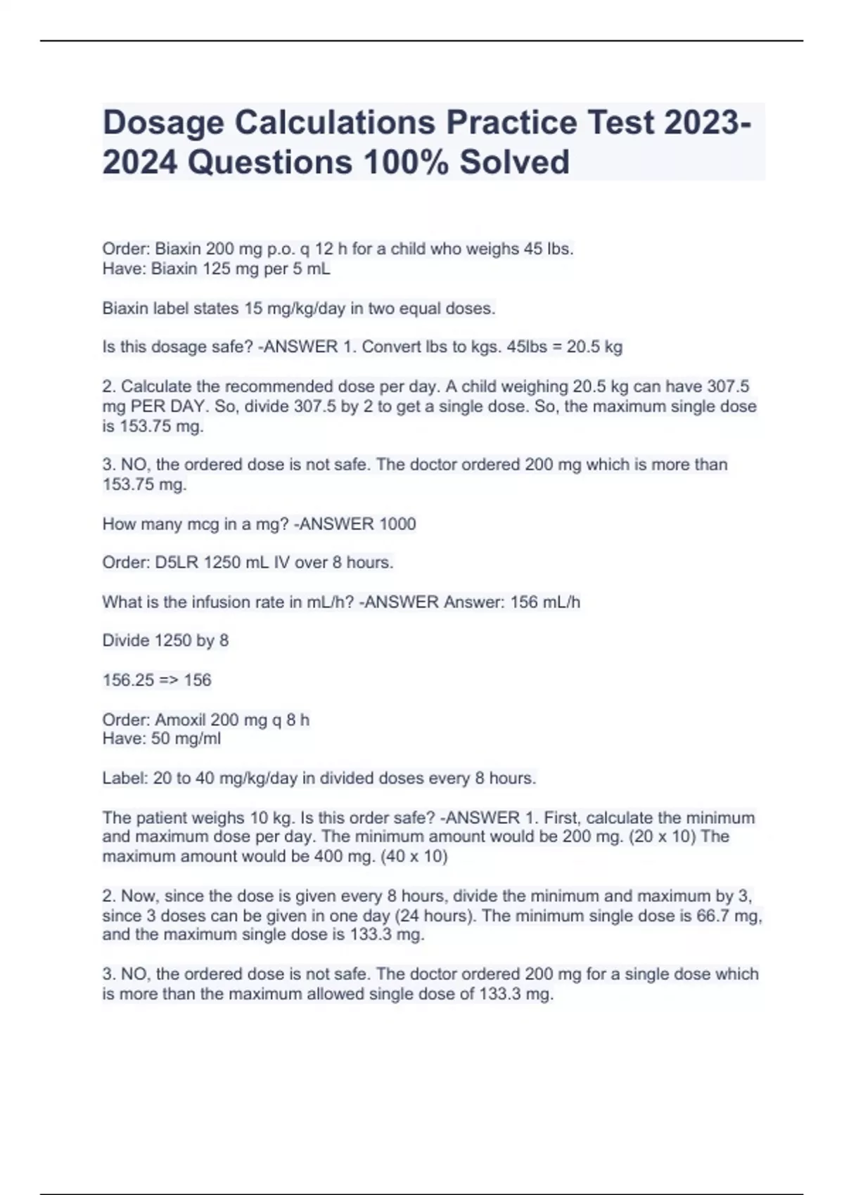 Dosage Calculations Practice Test Questions 100% SolvedDosage Calculations Practice Test Questions 100% SolvedDosage Calculations Practice Test Questions 100% SolvedOrder: Biaxin 200 mg p.o. q 12 h for a child who weighs 45 lbs. Have: Biaxin 125 mg per 5 mL Biaxin label states 15 mg/kg/day in two equal doses. Is this dosage safe? -ANSWER 1. Convert lbs to kgs. 45lbs = 20.5 kg 2. Calculate the recommended dose per day. A child weighing 20.5 kg can have 307.5 mg PER DAY. So, divide 307.5 by 2 to get a single dose. So, the maximum single dose is 153.75 mg. 3. NO, the ordered dose is not safe. The doctor ordered 200 mg which is more than 153.75 mg. How many mcg in a mg? -ANSWER 1000