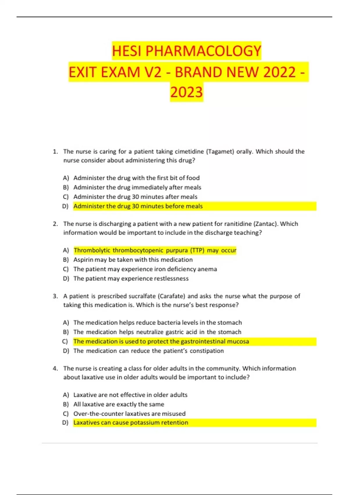 HESI PHARMACOLOGY EXIT EXAM V2 - BRAND NEW 2022 - 2023 1. The nurse is caring for a patient taking cimetidine (Tagamet) orally. Which should the nurse consider about administering this drug? A) Administer the drug with the first bit of food B) Administer the drug immediately after meals C) Administer the drug 30 minutes after meals D) Administer the drug 30 minutes before meals 2. The nurse is discharging a patient with a new patient for ranitidine (Zantac). Which information would be important to include in the discharge teaching? A) Thrombolytic thrombocytopenic purpura (TTP) may occur B) Aspirin may be taken with this medication C) The patient may experience iron deficiency anema D) The patient may experience restlessness 3. A patient is prescribed sucralfate (Carafate) and asks the nurse what the purpose of taking this medication is. Which is the nurse’s best response? A) The medication helps reduce bacteria levels in the stomach B) The medication helps neutralize gastric acid in the stomach C) The medication is used to protect the gastrointestinal mucosa D) The medication can reduce the patient’s constipation 4. The nurse is creating a class for older adultsin the community. Which information about laxative use in older adults would be important to include? A) Laxative are not effective in older adults B) All laxative are exactly the same C) Over-the-counter laxatives are misused D) Laxatives can cause potassium retention Peptic disease ulcer 5. The nurse is caring for a patient with a new order for an oral laxative. Which is a contraindication in administering an oral laxative? A) Cardiac problems B) Abdominal pain of unknown origin C) Several hemorrhoids D) Chronic constipation 6. The nurse is studying antacids that contain magnesium and calcium for the pharmacology exam. The student nurse remembersthat these antacidsshould be used with caution in patients with which condition? A) Hypertension B) Renal failure C) Heart failure D) 7. A patient asks the nurse how to best prevent constipation. Which class of laxative would the nurse recommend to this patient? A) Stimulant laxatives B) Bulk-forming laxatives C) Amollient laxatives D) Hyperosomatic laxative