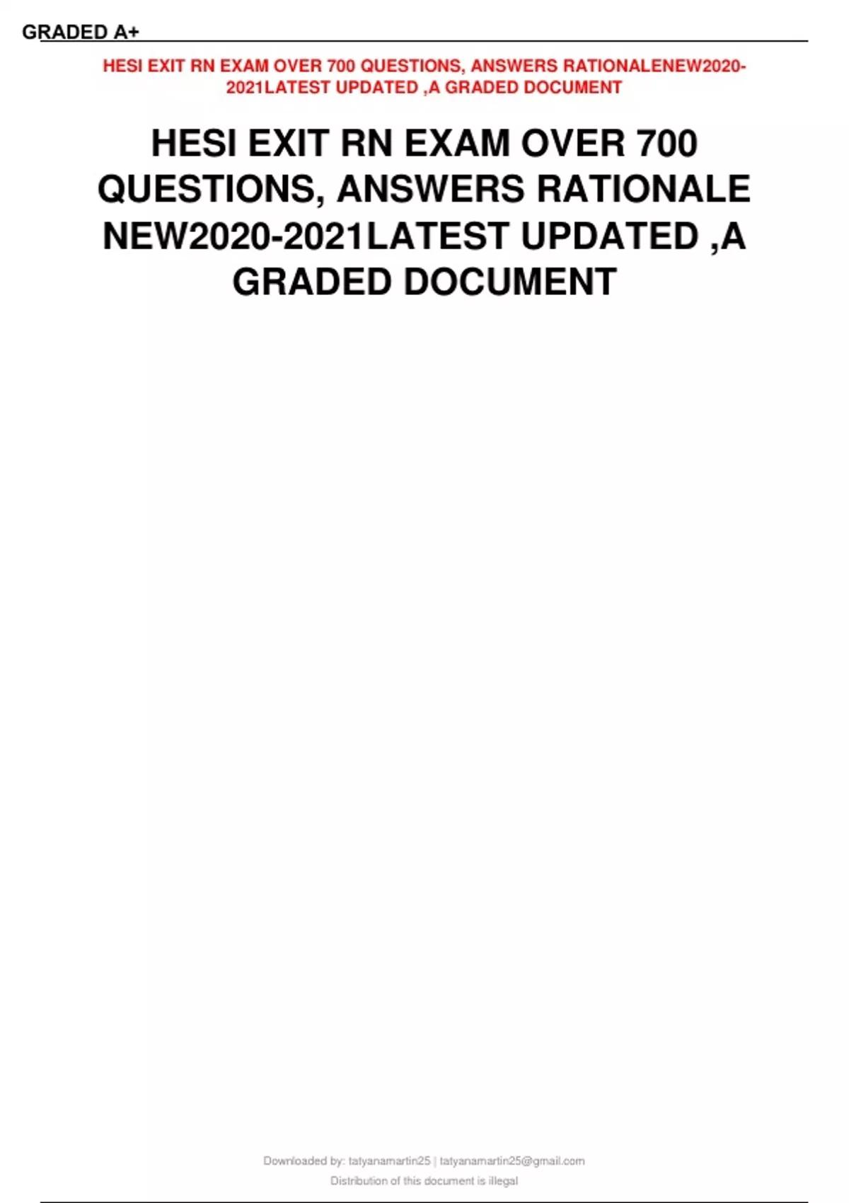 HESI EXIT RN EXAM OVER 700 QUESTIONS, ANSWERS RATIONALE NEW 2020/2021 1. Following discharge teaching, a male client with duodenal ulcer tells the nurse the he will drink plenty of dairy products, such as milk, to help coat and protect his ulcer. What is the best follow-up action by the nurse? a- Remind the client that it is also important to switch to decaffeinated coffee and tea. b- Suggest that the client also plan to eat frequent small meals to reduce discomfort c- Review with the client the need to avoid foods that are rich in milk and cream. d- Reinforce this teaching by asking the client to list a dairy food that he might select. Rationale: Diets rich in milk and cream stimulate gastric acid secretion and should be avoided. 2. A male client with hypertension, who received new antihypertensive prescriptions at his last visit returns to the clinic two weeks later to evaluate his blood pressure (BP). His BP is 158/106 and he admits that he has not been taking the prescribed medication because the drugs make him “feel bad”. In explaining the need for hypertension control, the nurse should stress that an elevated BP places the client at risk for which pathophysiological condition? GRADED A+ HESI EXIT RN EXAM OVER 700 QUESTIONS, ANSWERS RATIONALENEW2020- 2021LATEST UPDATED ,A GRADED DOCUMENT Downloaded by: tatyanamartin25 | Distribution of this document is illegal a- Blindness secondary to cataracts b- Acute kidney injury due to glomerular damage c- Stroke secondary to hemorrhage d- Heart block due to myocardial damage Rationale: Stroke related to cerebral hemorrhage is major risk for uncontrolled hypertension. 3. The nurse observes an unlicensed assistive personnel (UAP) positioning a newly admitted client who has a seizure disorder. The client is supine and the UAP is placing soft pillows along the side rails. What action should the nurse implement? a- Ensure that the UAP has placed the pillows effectively to protect the client. b- Instruct the UAP to obtain soft blankets to secure to the side rails instead of pillows. a- Assume responsibility for placing the pillows while the UAP completes another task. b- Ask the UAP to use some of the pillows to prop the client in a side lying position. Rationale: The nurse should instruct the UAP to pad the side rails with soft blankest because the use of pillows could result in suffocation and would need to be removed at the onset of the seizure. The nurse can delegate paddling the side rails to the UAP 4. An adolescent with major depressive disorder has been taking duloxetine (Cymbalta) for the past 12 days. Which assessment finding requires immediate follow-up? GRADED A+ HESI EXIT RN EXAM OVER 700 QUESTIONS, ANSWERS RATIONALENEW2020- 2021LATEST UPDATED ,A GRADED DOCUMENT Downloaded by: tatyanamartin25 | Distribution of this document is illegal a- Describes life without purpose b- Complains of nausea and loss of appetite c- States is often fatigued and drowsy d- Exhibits an increase in sweating. Rationale: Cymbalta is a selective serotonin and norepinephrine reuptake inhibitor that is known to increase the risk of suicidal thinking in adolescents and young adults with major depressive disorder. B, C and D are side effects 5. A 60-year-old female client with a positive family history of ovarian cancer has developed an abdominal mass and is being evaluated for possible ovarian cancer. Her Papanicolau (Pap) smear results are negative. What information should the nurse include in the client‟s teaching plan? a- Further evaluation involving surgery may be needed b- A pelvic exam is also needed before cancer is ruled out c- Pap smear evaluation should be continued every six month d- One additional negative pap smear in six months is needed. Rationale: An abdominal mass in a client with a family history for ovarian cancer should be evaluated carefully 6. A client who recently underwear a tracheostomy is being prepared for discharge to home. Which instructions is most important for the nurse to include in the discharge plan? a- Explain how to use communication tools. b- Teach tracheal suctioning techniques c- Encourage self-care and independence. d- Demonstrate how to clean tracheostomy site