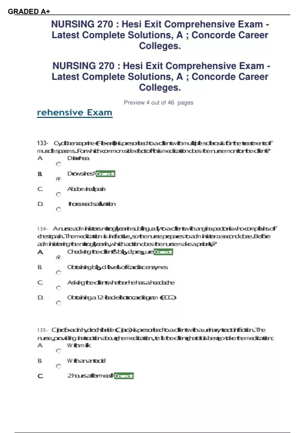 NURSING 270 : Hesi Exit Comprehensive Exam 2024 133- Cyclobenzaprine (Flexeril) is prescribed to a client with multiple sclerosis for the treatment of muscle spasms. For which common side effect of this medication does the nurse monitor the client? A. Diarrhea B. Drowsiness Correct C. Abdominal pain D. Increased salivation 134 - A nurse administers nitroglycerin sublingually to a client with angina pectoris who complains of chest pain. The medication is ineffective, so the nurse prepares to administer a second dose. Before administering the nitroglycerin, which action does the nurse make a priority? A. Checking the client's blood pressure Correct B. Obtaining blood levels of cardiac enzymes C. Asking the client whether he has a headache D. Obtaining a 12-lead electrocardiogram (ECG) 135- Ciprofloxacin hydrochloride (Cipro) is prescribed to a client with a urinary tract infection. The nurse, providing instruction about the medication, tells the client that it is best to take the medication: A. With milk B. With an antacid C. 2 hours after meals Correct D. With aluminum hydroxide 136.- A nurse provides home care instructions to a client with coronary artery disease (CAD) who is being discharged from the hospital. Which statement by the client indicates a need for further instruction?